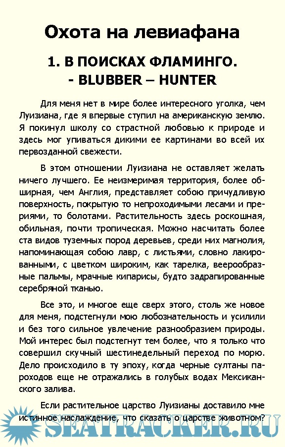 Содержание Охота на Левиафана В поисках фламинго. Охотник за ворванью "Летучее облако" Рождественское утро посреди океана Кит. Удар хвостом. В открытое море! Помните Билла! Спасение. Полярный бассейн. Пари по поводу кита Калифорнийский кит среди убийц Маленький моржонок Пустынный берег Кит, который "подмигивает" Трудное отступление Ледяной бивак. Осажденные медведями Отчаяние. Флаг из медвежьей шкуры На буксире у кита Наугад. Берем в проводники чаек Мы направляемся к лисьим островам Что значит "метка". Пока в безопасности Сеньор Сальвадор Фанданго. Заподозренный лоцман Требуется доктор. На волос от ампутации Таинственная лодка. Бедные люди! Опять "дерзкая Сара". Окончательный триумф капитана Дринкуотера На море