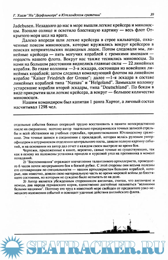 К наиболее заметным из всей мемуарной литературы, изданной в Германии в 20-х годах, следует отнести воспоминания адмирала Рейнхарда Шеера, командовавшего во время войны Флотом Открытого моря, и капитана 2 ранга Георга Хаазе - старшего артиллерийского офицера прославившегося своей умелой стрельбой линейного крейсера "Дерфлингер".