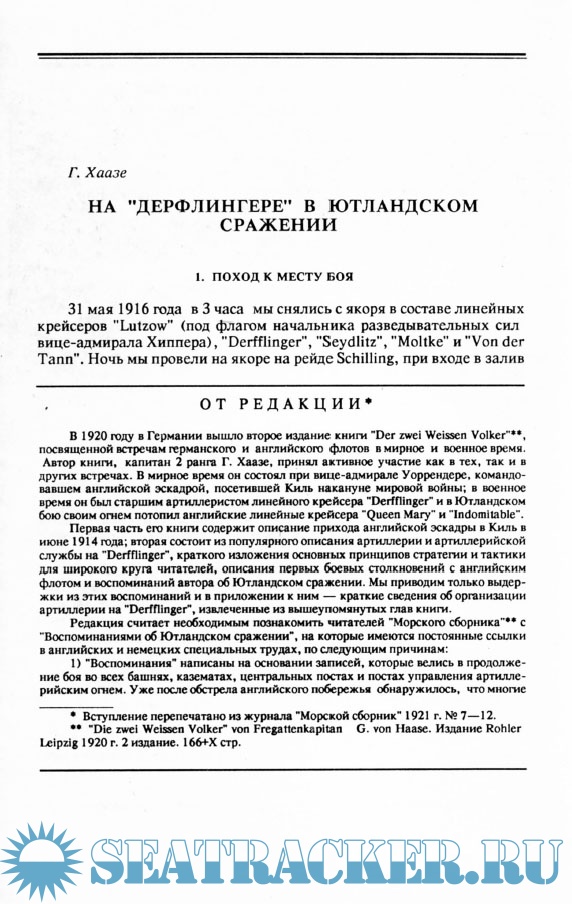 Описание Г. Хаазе Ютландского боя и царившей в тот момент обстановки на "Дерфлингере" также интересно, ибо дает представление об уровне развития военного кораблестроения и вооружений того времени и показывает морской бой так, как если бы читатель сам являлся участником тех, давно ушедших в историю драматических событий. В альманах вошли отрывки из книг Р. Шеера "Германский флот в Мировую войну". Военмориздат 1940 г. и Г. Хаазе "Два великих белых народа". Лейпциг 1920 г. (Сокращенный перевод опубликован в журнале "Морской сборник", №№ 7-12, 1920 г.). Кроме того, в выпуске дана версия о бое у Доггербанки и английской стороны. (Текст взят из журнала "Морской сборник", №№ 7-12 за 1920 г.). Названия кораблей даны так, как были напечатаны в указанных источниках.