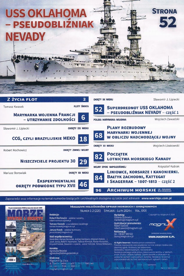 Description: Польский морской журнал. Издается с 1996 года, первоначально как ежеквартальный. С 1999 года издается раз в два месяца, а с 2007 года-как ежемесячный. Первоначально назывался Morza Statki i Okrety, в 2006 году переименован в Morze Statki i Okrety. С 2004 года полностью цветной (ранее только вставки). В 2008 году стали издаваться специальные выпуски, первоначально нерегулярные. С 2014 года выпускается как обычное издание и специальное издание, с непрерывной нумерацией.