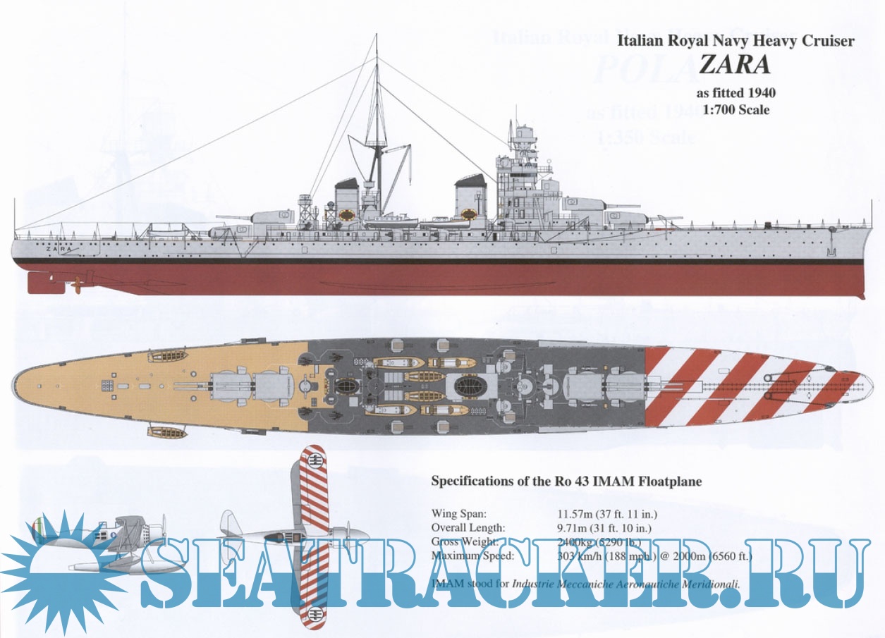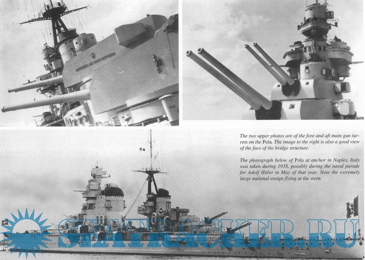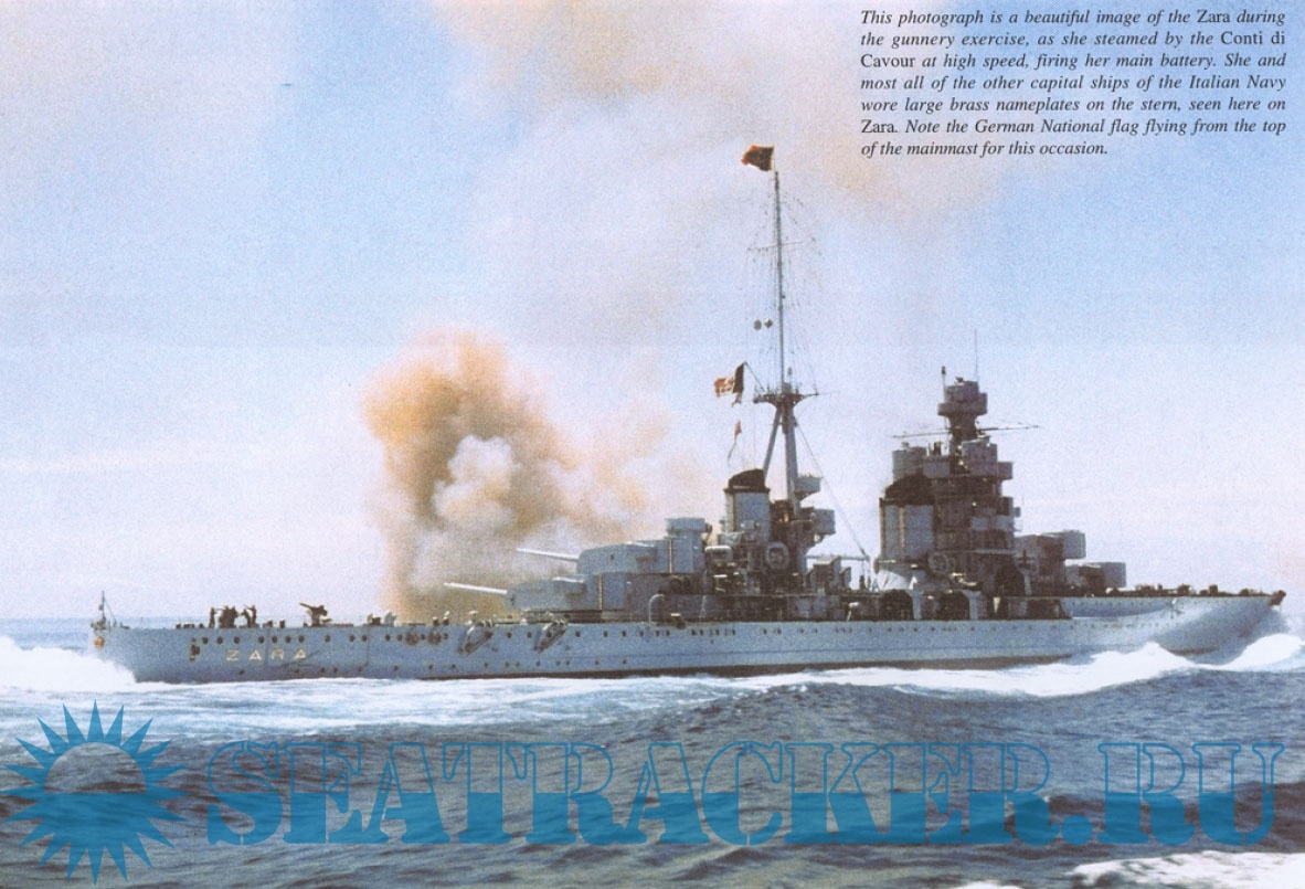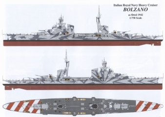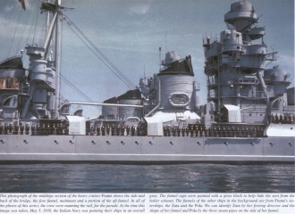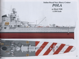 Description: There were only seven heavy cruisers constructed for the Italian navy in the late 1920s and 1930s, so they are well covered in this 70-page book. Design histories are sparse. Most of the book describes and shows operational deployments. There are numerous photos, even several in color, which I think was unusual for the time period. There are also separate colored deck and longitudinal renderings covering every ship.