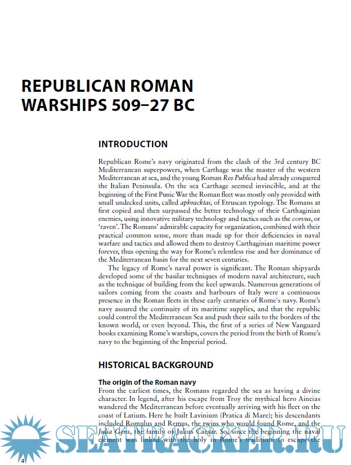 Year: 2015 Language: English Author: Raffaele D’Amato Publisher: Osprey Publishing Edition: New Vanguard 225 Format: PDF Quality: eBook Pages count: 49 Description: The birth of the mighty Roman Navy was anchored in the Romans' extraordinary ability to absorb and perfect the technology of other states and empires. Indeed, during the clash of the great Mediterranean powers in the Punic Wars of the 3rd century, Rome had little or no naval force to speak of, just a humble fleet of the tiny Etruscan Aphraktoi, and it was the Carthaginians who reigned supreme at sea. Yet in a remarkably short space of time, the Romans at first copied, and then surpassed the superior Carthaginian maritime technology, incorporating designs such as the corvus (boarding bridge). Before long, the Cartaginians had been decisively smashed, paving the way for Rome to become the dominant naval power in the Mediterranean for the next seven centuries. This is the story of the design, development and operation of the Republican Roman warship in the age of the conquest of the Mediterranean, from the first Roman naval adventure of 394 BC and the Punic Wars, to Pompey's operations against the Cilician Pirates and Caesar's victorious naval campaigns in Armorica, concluding with the consolidation of the Mediterranean Sea as Mare Nostrum with the battle of Actium in 31 BC. Archaeological photography, including those of exciting new finds, such as the Roman warship rostra (rams) found in the Aegates Islands, accompany lavish artistic reconstructions in illustrating the ships of the first Roman navy.