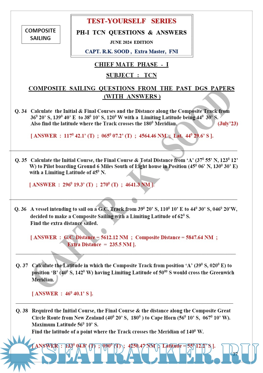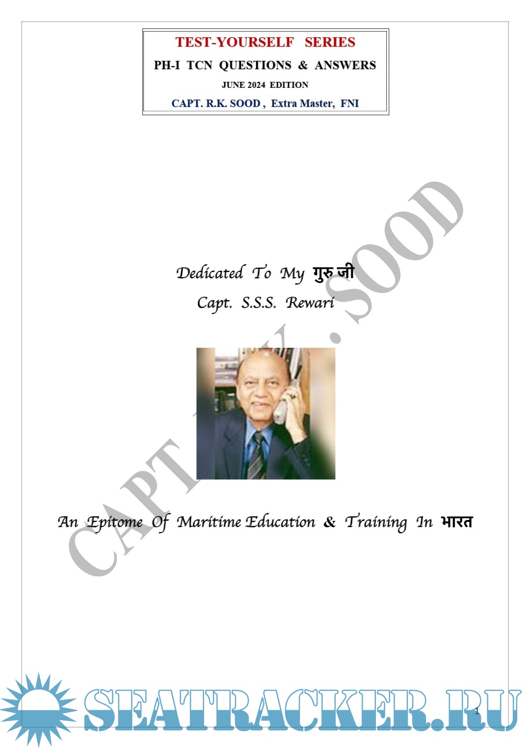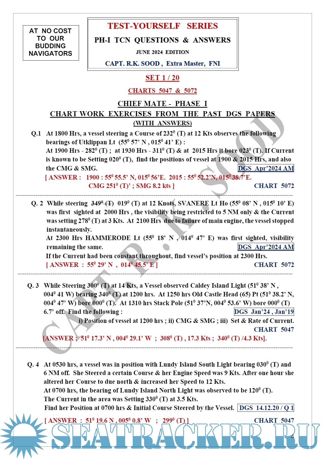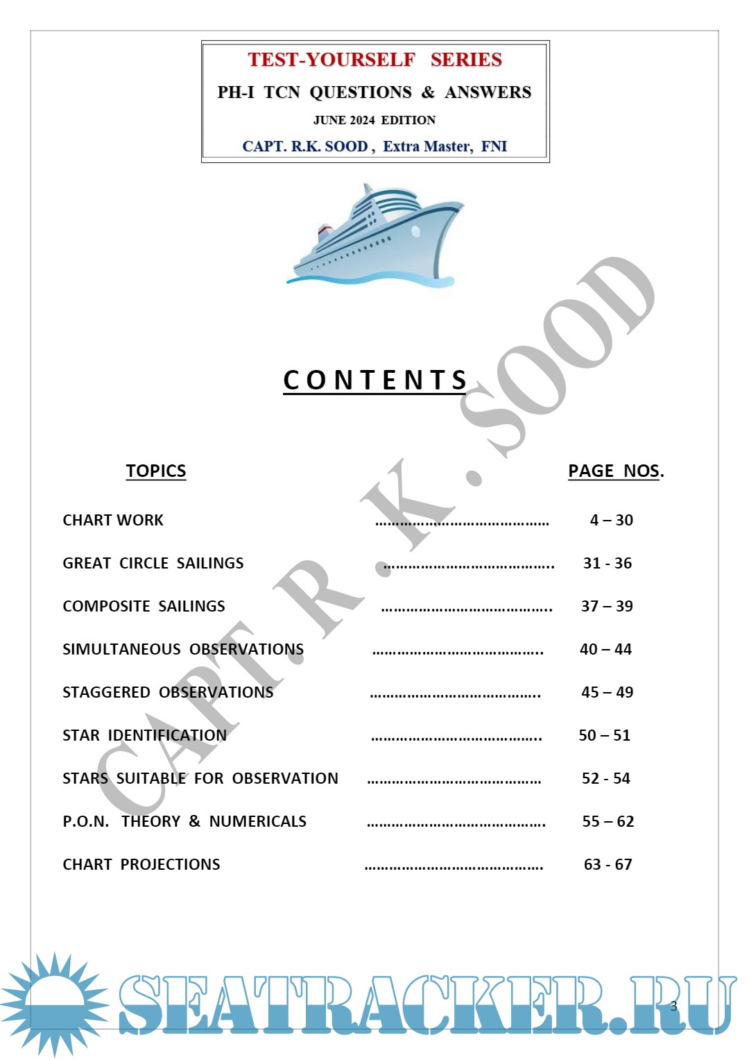Year: 2024 Language: English Author: Capt. R.K. Sood Edition: 5th (June) Format: PDF Quality: eBook Pages count: 68 Description: From the author: Dear Students & Faculty, There has long been a need of Students for a reliable book in the form of a ‘Test-Yourself Series’ giving ‘Answers’ to the ‘Questions’ which have appeared in the past Question Papers of COMPETENCY EXAMINATIONS held by the Directorate General Of Shipping, M.O.T. , so that Students could practice & check their own Competence while preparing for their COMPETENCY Examinations. Hence, this is a ‘Practice-Tool’ to cater to that need and relates to the Subject of T.C.N. (TERRESTRIAL & CELESTIAL NAVIGATION) of Chief Mate (F.G.) Course. To cover an entire Subject of T.C.N. , Questions of all types have been included in this Series. I remember, over half-a-century back, when I was preparing for my own Competency Examinations, somewhat similar ‘tool’ in the form of a U.K. published “SELF EXAMINER” existed which helped me & my fellow Officers immensely in realizing our dreams of clearing our Competency Examinations quickly ! Since this is the 5th Edition of this particular “TEST-YOURSELF SERIES”, any earlier Errors/Typos have been corrected/removed. I thank my present & past Students for vetting the Solutions & Answers to the Questions given in this hand-out. However, should you still find any more Errors, be so kind as to bring these to my notice to enable me to make Corrections. Wishing you all, SUCCESS in your Competency Examinations & Safe Sailings. Additional info: About the author: (Ex Principal FOSMA New Delhi & FOSMA NOIDA). Ex DGS Approved Examiner for Masters & Mates. 30 Years of Teaching Experience in D.G.S. approved Post-Sea Maritime Institutes. Over 23 Years of Sailing Experience on Foreign-Going Ships, including 14 Years as Master. Now, teaching as an EXPERT / SPECIALIST Faculty in A.R.I. , New Delhi.