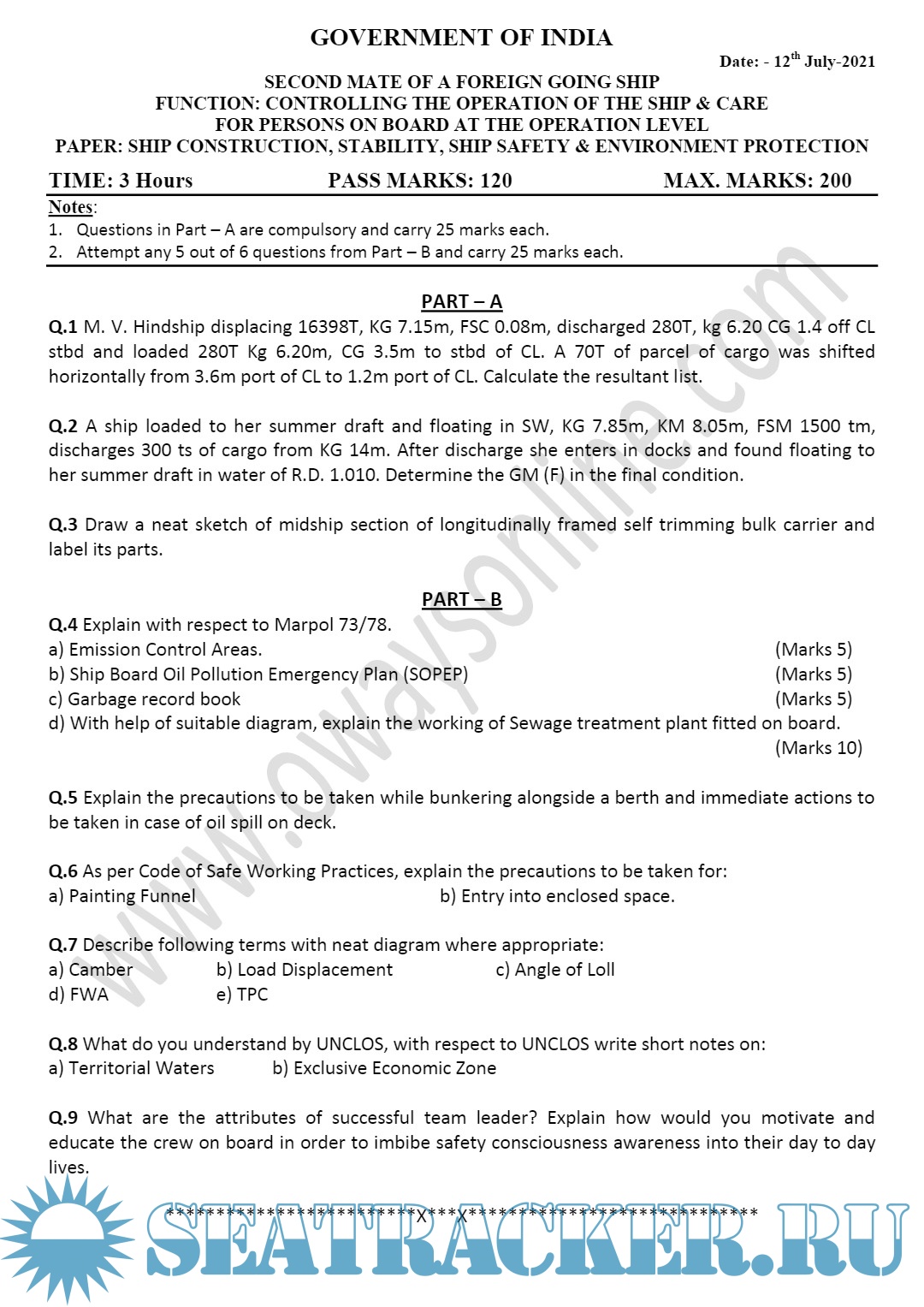 Question Paper Set (May 2024) for Second Mate (F.G.) Mercantile Marine Department (MMD), India Examinations