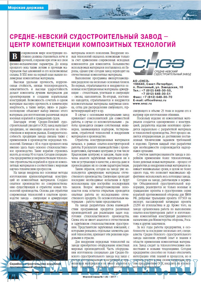 Год выпуска: 2017 Язык: Русский Автор: группа авторов Жанр: Периодическое издание (журнал) Издательство: Зеркало Петербурга Формат: PDF Качество: Изначально компьютерное (eBook) Количество страниц: 40 Описание: В северной столице проводятся фундаментальные исследования и создаются перспективные образцы военной техники и вооружения. Важнейшая роль Петербурга в российском кораблестроении и оборонно-промышленном комплексе придают особый статус Международному военно-морскому салону. Он проводится с 2003 года и стал одним из наиболее ярких событий в деловом календаре Петербурга, снискал репутацию одного из самых престижных форумов мирового морского сообщества.