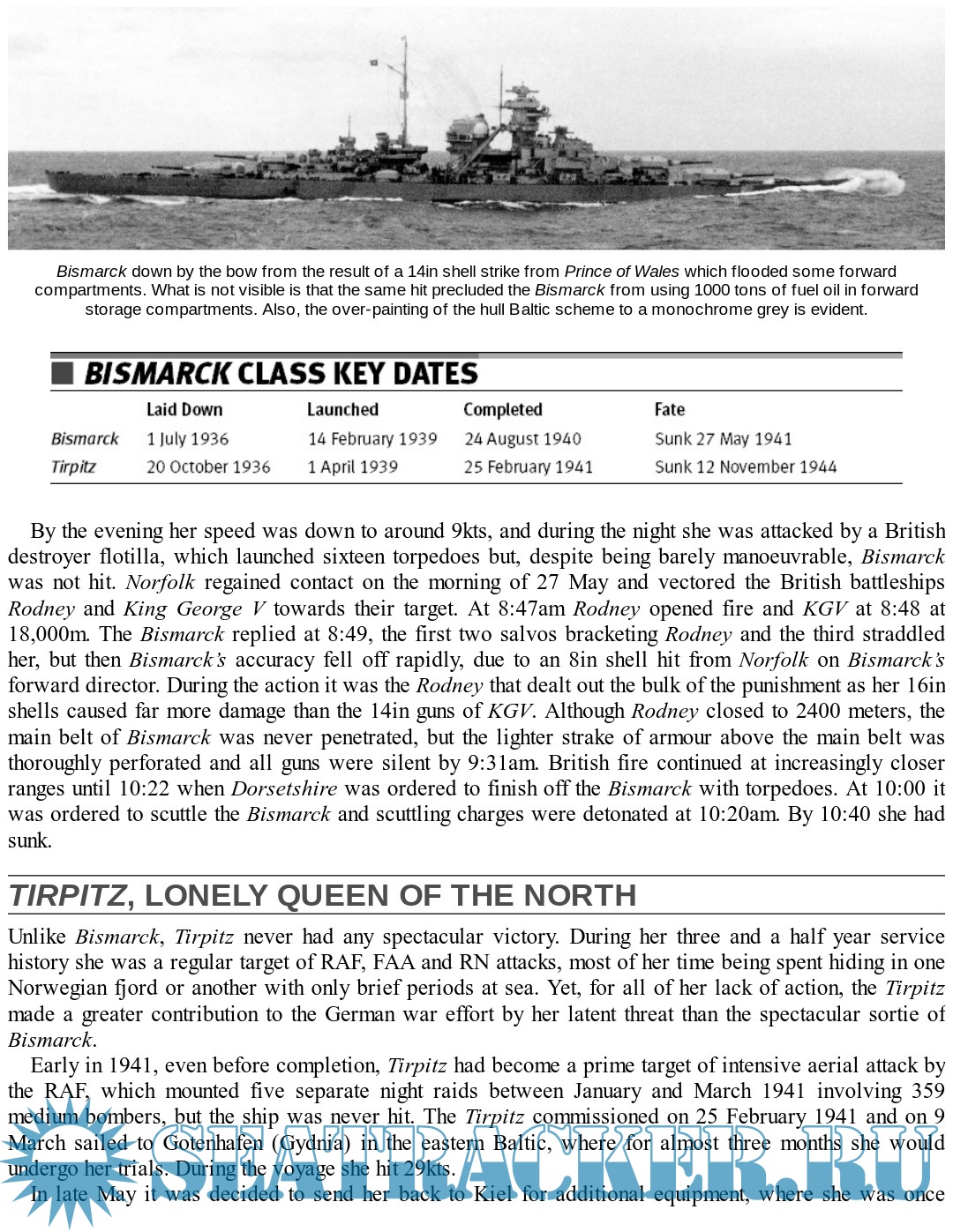 This volume covers the famous German sister-ships whose fates were so very different - Bismarck had a short but glorious career, first sinking HMS Hood and then in turn being sunk by the Home Fleet, whereas the Tirpitz spent most of the war skulking in Norwegian fjords, fending off attacks by midget submarines and carrier aircraft before being finally sunk by enormous specially designed bombs dropped by RAF Lancasters.