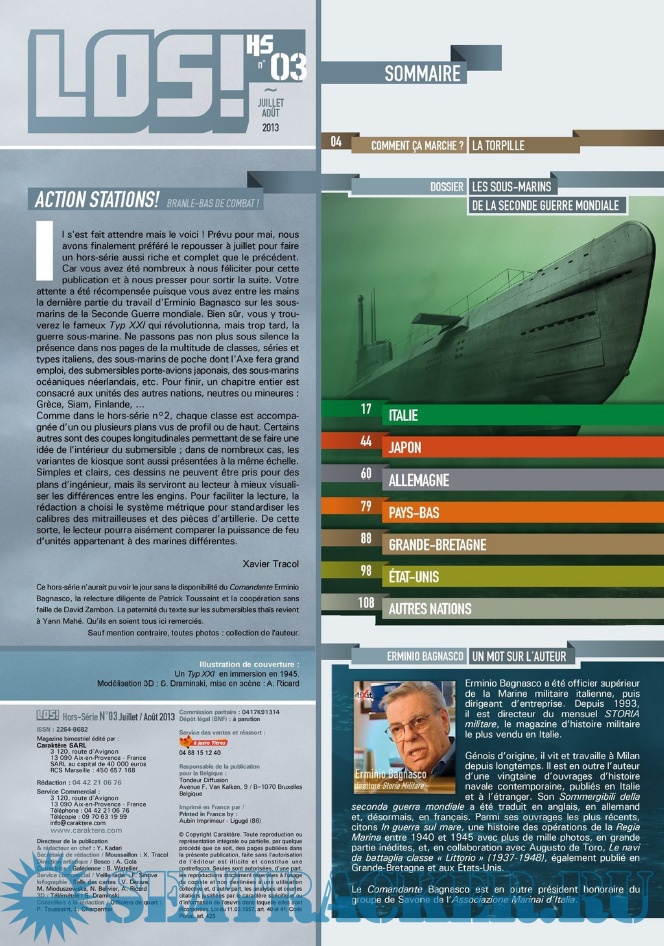 Description: LES ÉDITIONS CARAKTÈRE PRENNENT LE LARGE EN LANÇANT UN NOUVEAU MAGAZINE CONSACRÉ À LA GUERRE NAVALE !Les sujets passionnants ne manquent pas et LOS ! met un point d’honneur à les présenter au lecteur comme cela n’a jamais été fait dans la presse française jusqu’à présent. Un seul mot d’ordre pour l’équipe rédactionnelle : rigueur scientifique et présentation ludique !S’appuyant sur un fond photographique d’exception, sur des plans de bateaux et d’avions, les éditions Caraktère innovent une fois de plus en vous proposant aussi des vues 3D détaillées, le tout au service de textes soigneusement rédigés par des auteurs spécialisés. Vous comprendrez ainsi comment fonctionne un submersible, comment se déroule un combat naval, comment est conçu un cuirassé ou comment attaquent les avions-torpilleurs !Revivez au fil des pages l’aventure humaine exceptionnelle des matelots de la marine marchande affrontant les U-Boote en Arctique, ou celle des pilotes embarqués sur les porte-avions américains et japonais. Lisez les exploits des hommes-grenouilles italiens en Méditerranée, des équipages des vedettes lance-torpilles dans la Manche, des sous-marins soviétiques de la guerre froide ou des grands cuirassés de 1914-18