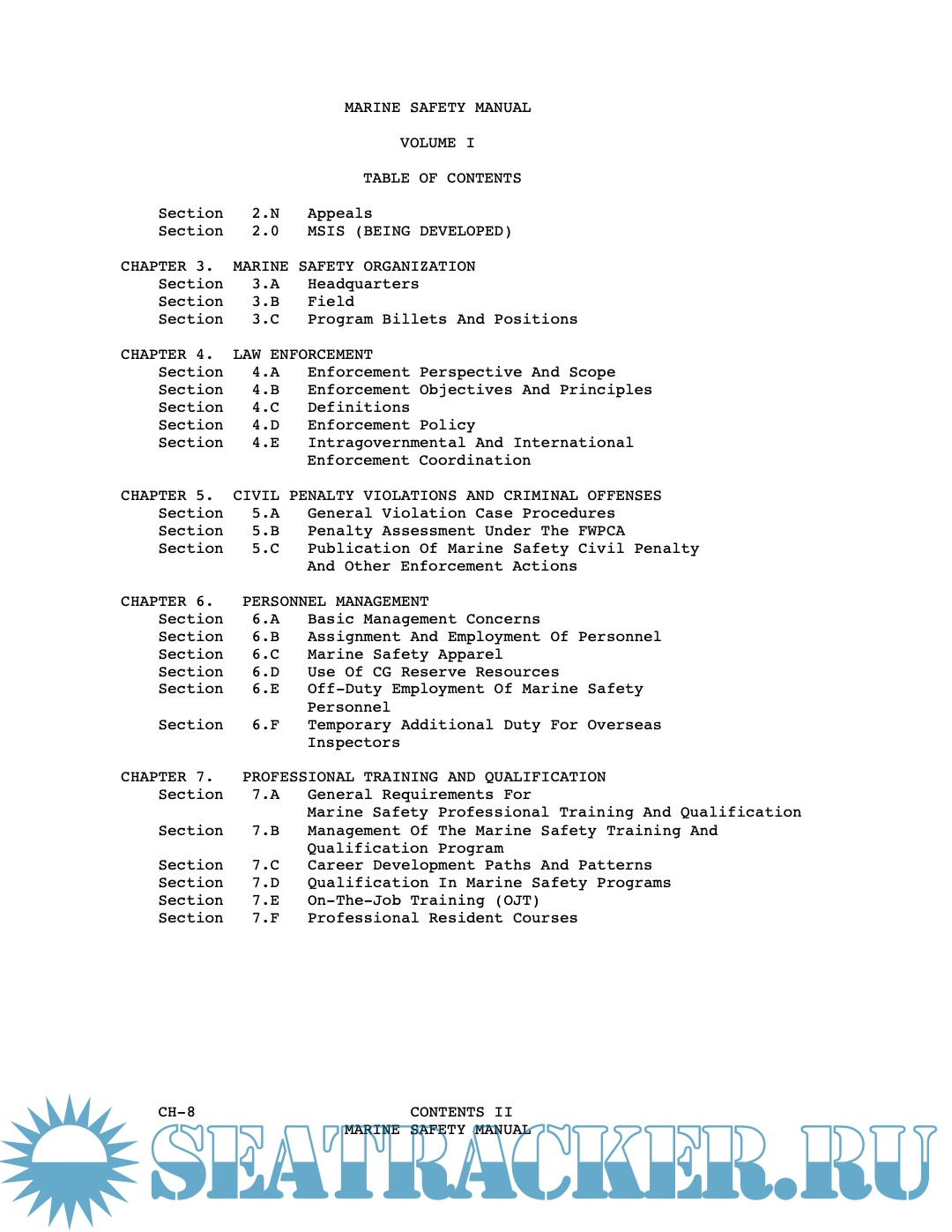 Year: 2012 Language: English Author: P.F. Thomas Genre: Manual Publisher: USCG Format: PDF Quality: eBook Pages count: 500 Description: The MSM is the primary policy and procedural statement for the marine safety programs of the Coast Guard. Published for the use of all Coast industry personnel, it prescribes the essential functions which must be performed to attain the overall objectives of the CVS and PES/MER/WWM Programs and certain investigative functions of the RBS Program. The MSM should be used as a guide for consistent and uniform administration of marine safety activities, without undue hampering of independent action and judgment by marine safety personnel.