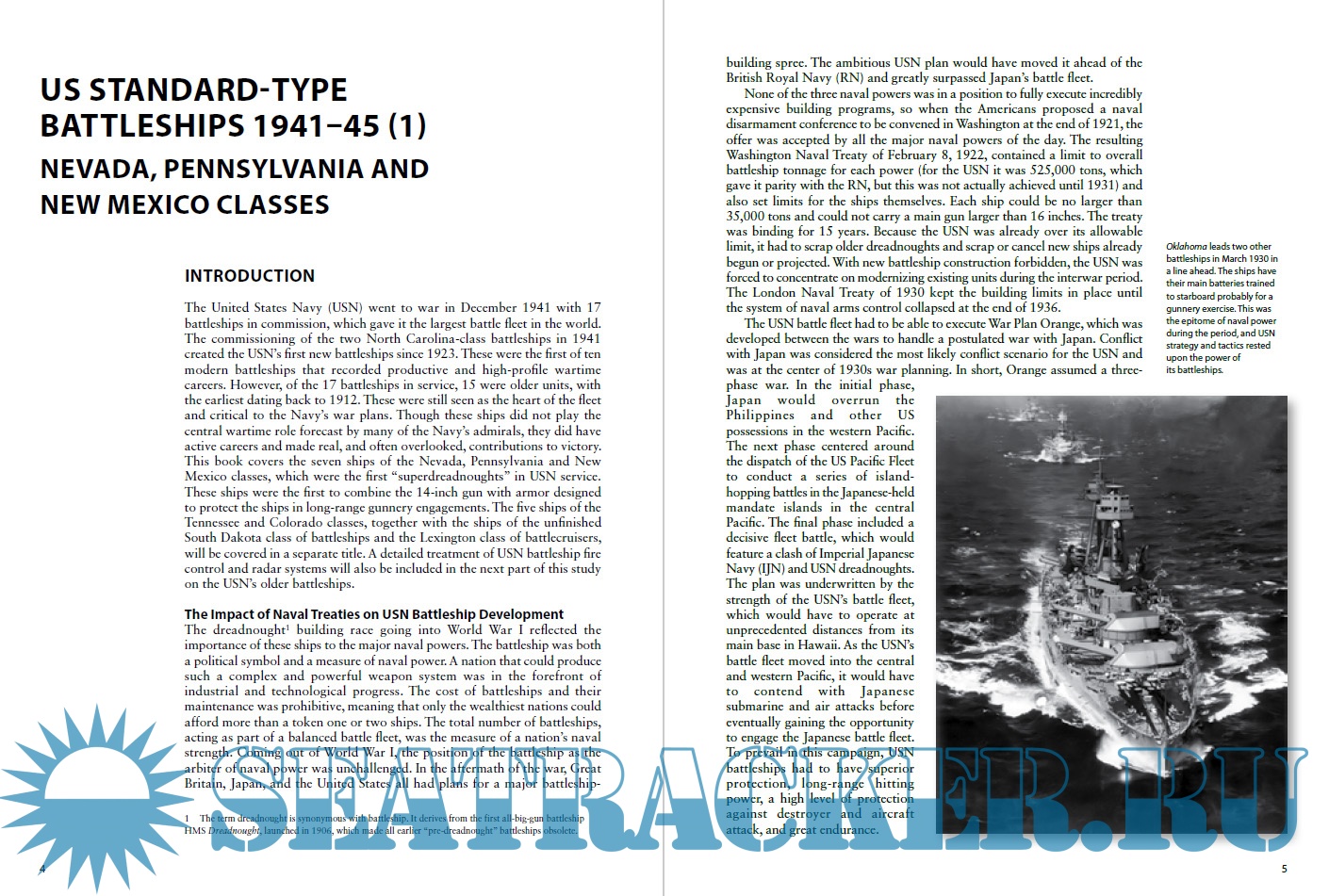 Year: 2015 Language: English Author: Mark Stille Genre: History Edition: New Vanguard, 220 Format: PDF Quality: eBook Pages count: 49 Description: Written by US Navy expert Mark Stille, this book offers a unique insight into the Standard-type classes of US battleships in World War II. It provides a detailed investigation into the histories of each of the individual vessels of the Standard-type battleship class, the first three of which, the Nevada, Pennsylvania and New Mexico, formed the US Navy's main force in the inter-war period. The Standard-types reflected a new design philosophy: by designing each class to meet common standards of maneuverability and handling, vessels of different classes could operate as a single tactical unit without being limited by the performance of the slowest and least maneuvrable ship. At the time of their construction, these ships incorporated the latest design features such as triple gun turrets. Although they were rendered increasingly obsolete by evolving naval doctrines and the ascendance of the fast battleship, they served with distinction throughout World War II in both the Pacific and the Atlantic. This study combines analysis of design features and an absorbing narrative of operational histories to offer a comprehensive picture of the Standard- type battleships, from the brutal destruction of the USS Arizona to the triumphant occupation of Japan.