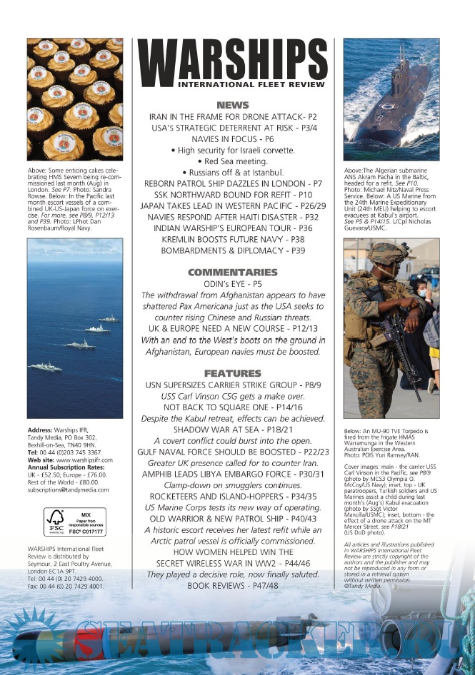 Description: Warships IFR puts the spotlight on the latest developments in the world’s navies. It covers current defence issues and has comments by leading analysts. The magazine regularly includes features on the Royal Navy and the US Navy in addition to incorporating news and features on all other navies across the globe. Warships IFR frequently carries in-depth articles on naval heritage.WARSHIPS International Fleet Review is published 12 times a year by Tandy Media Ltd who also publish Shipping Today & Yesterday (which provides news and features from the world of merchant shipping).