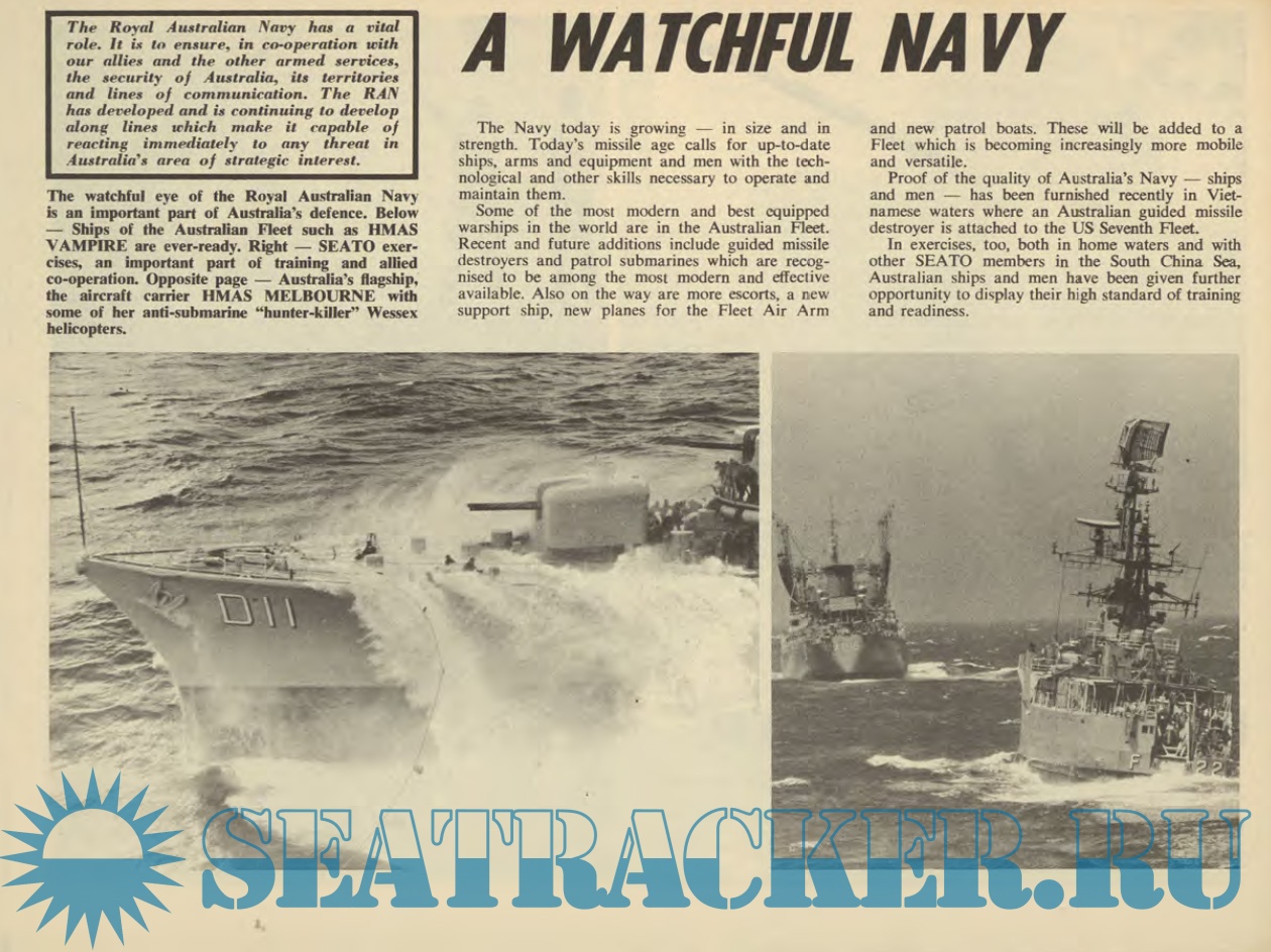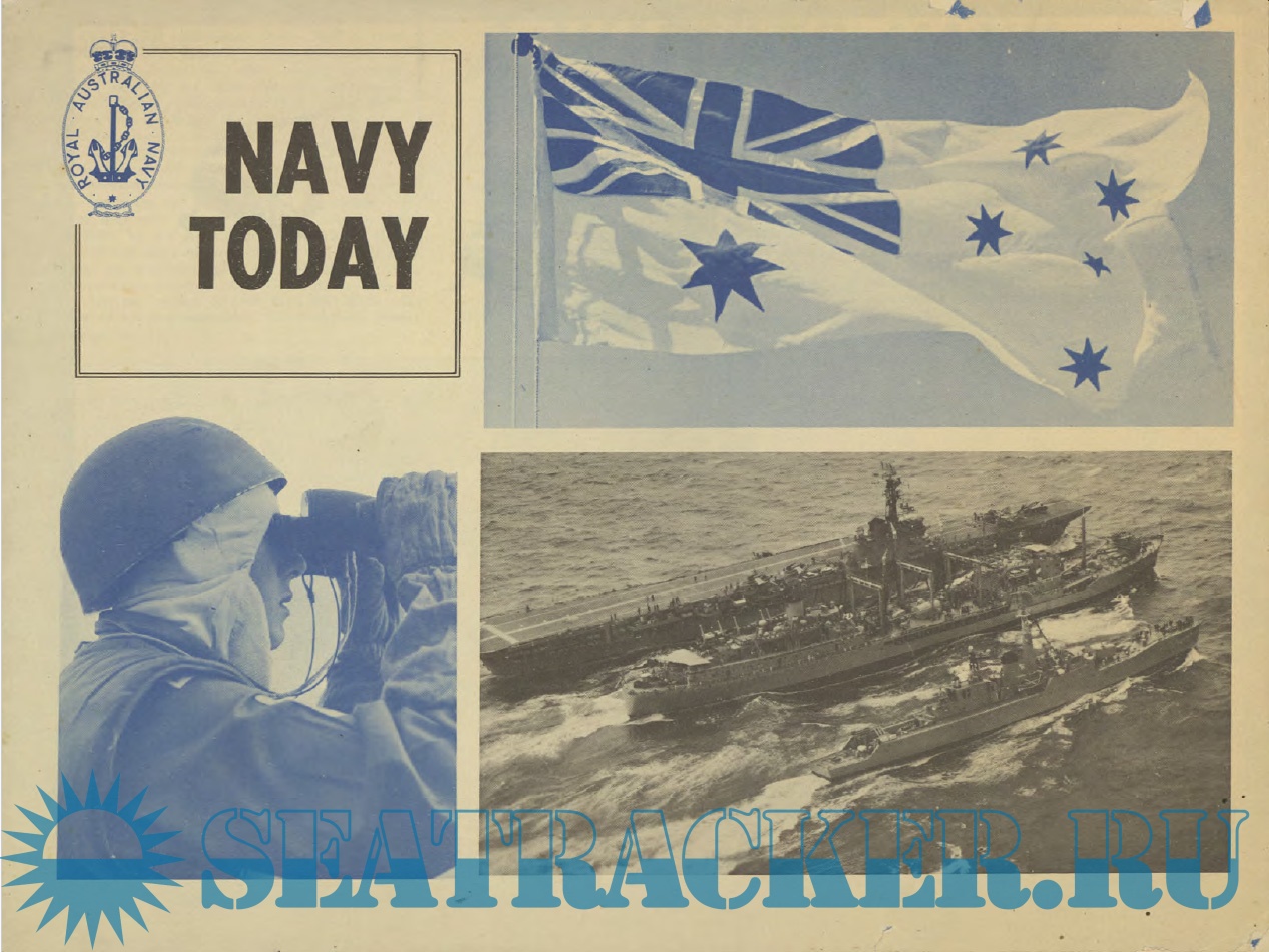 Year: 1961 Language: English Author: Kenmure Genre: Periodical (magazine) Publisher: Kenmure Press Pty Format: PDF Quality: Scanned pages Pages count: 14 Description: The first editions of Navy Today were published in the early 1960s to provide a snapshot of the contemporary RAN Fleet and a brief commentary on operations in which the RAN was involved. The booklets were distributed by Navy Public Relations and through Navy Recruiting centres around Australia and were produced in various formats until the mid 1990s at which time web-based technology took over.