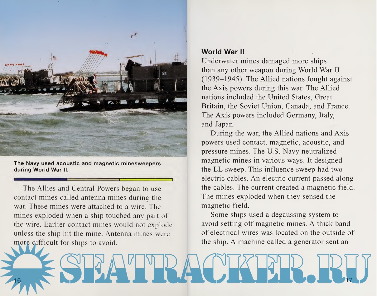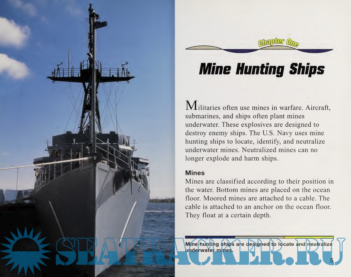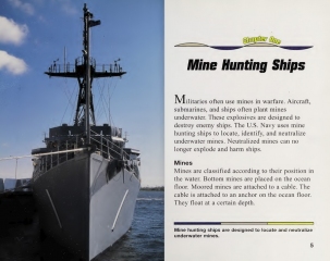 Description: Provides information about different types of mines and explains the history of mine hunting ships and how they hunt for and deactivate mines.