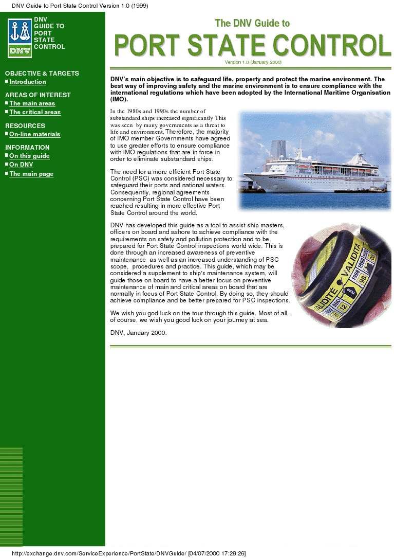 DNV разработало это руководство в качестве инструмента для оказания помощи капитанам судов, должностных лиц на борту и на берегу, чтобы обеспечить соблюдение требований по охране безопасности и загрязнения окружающей среды и быть готовым к контролю судов государством порта инспекции по всему миру. Это делается посредством повышения осведомленности о профилактике, а также более глубокого понимания PSC сферы, процедур и практики. Это руководство, которое может рассматриваться как дополнение к техническому обслуживанию системы корабля, будет руководить, находящихся на борту, чтобы лучше сосредоточиться на профилактике основных и важнейших областях на борту, которые, как правило, в центре внимания по контролю судов государством порта. Поступая таким образом, они должны обеспечить соблюдение всех норм и лучше подготовиться к инспекции PSC.
