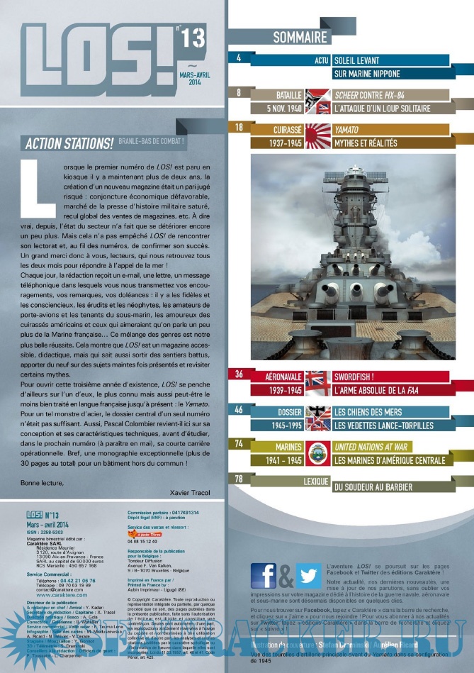 Year: 2014 Language: French Author: Collective Genre: Periodical (magazine) Edition: 2014 03-04 Format: PDF Quality: eBook Pages count: 84 Description: LES ÉDITIONS CARAKTÈRE PRENNENT LE LARGE EN LANÇANT UN NOUVEAU MAGAZINE CONSACRÉ À LA GUERRE NAVALE !Les sujets passionnants ne manquent pas et LOS ! met un point d’honneur à les présenter au lecteur comme cela n’a jamais été fait dans la presse française jusqu’à présent. Un seul mot d’ordre pour l’équipe rédactionnelle : rigueur scientifique et présentation ludique !S’appuyant sur un fond photographique d’exception, sur des plans de bateaux et d’avions, les éditions Caraktère innovent une fois de plus en vous proposant aussi des vues 3D détaillées, le tout au service de textes soigneusement rédigés par des auteurs spécialisés. Vous comprendrez ainsi comment fonctionne un submersible, comment se déroule un combat naval, comment est conçu un cuirassé ou comment attaquent les avions-torpilleurs !Revivez au fil des pages l’aventure humaine exceptionnelle des matelots de la marine marchande affrontant les U-Boote en Arctique, ou celle des pilotes embarqués sur les porte-avions américains et japonais. Lisez les exploits des hommes-grenouilles italiens en Méditerranée, des équipages des vedettes lance-torpilles dans la Manche, des sous-marins soviétiques de la guerre froide ou des grands cuirassés de 1914-18