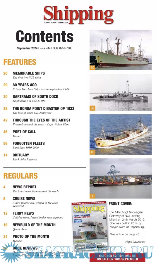 Year: 2024 Language: English Author: Nigel Lawrence (Editor) Genre: Periodical (magazine) Edition: 2024-09 Format: PDF Quality: eBook Pages count: 68 Description: Shipping T&Y is a monthly magazine for the shipping enthusiast offering up-to-date information, topical and in-depth historical articles alongside images, many of which are exclusive to the magazine.Shipping Today & Yesterday is a specialist magazine for the shipping enthusiast offering up-to-date information, topical and in-depth historical articles.Shipping Today & Yesterday was first produced in March 1990 by, the then Editor and Publisher, John Young. The first edition stated that it would, “offer a news service covering important developments in the Shipping industry Today and will look back at ships and events of Yesterday, with regular features on merchant ships
