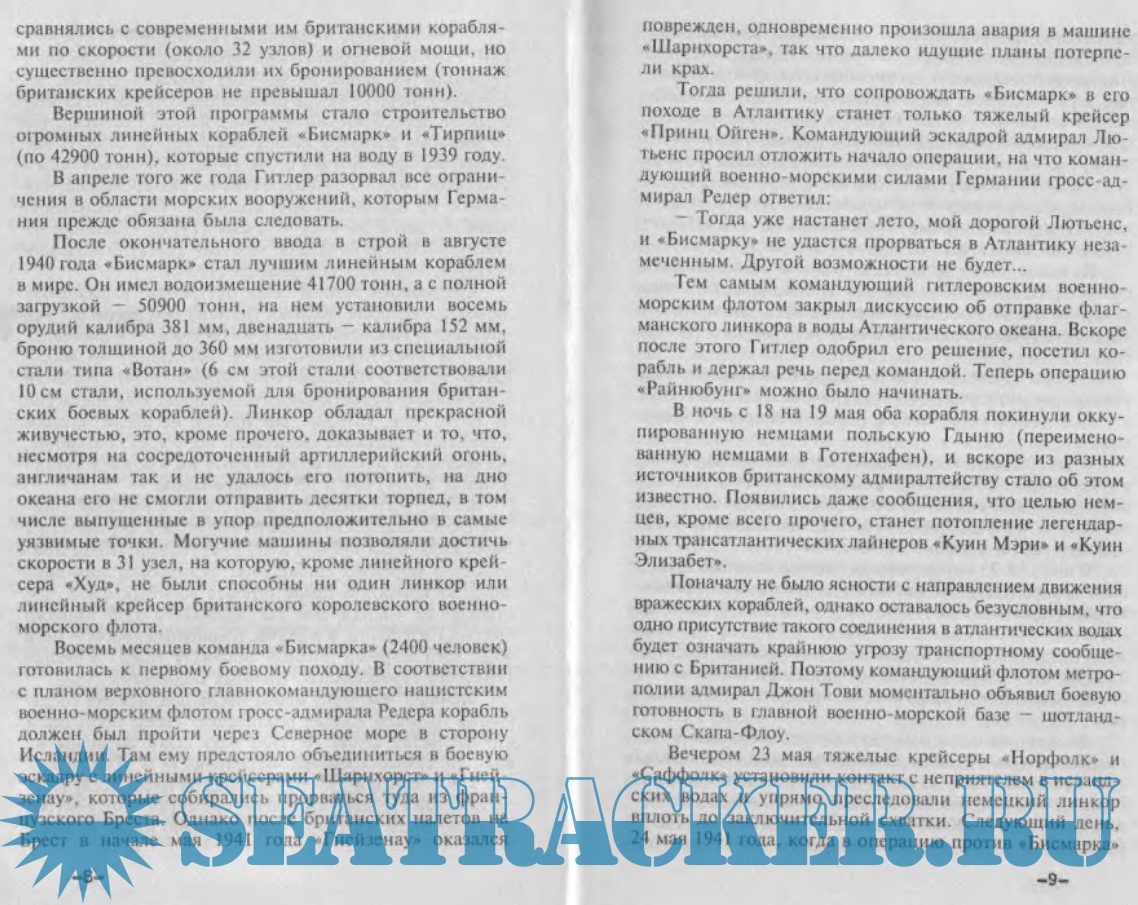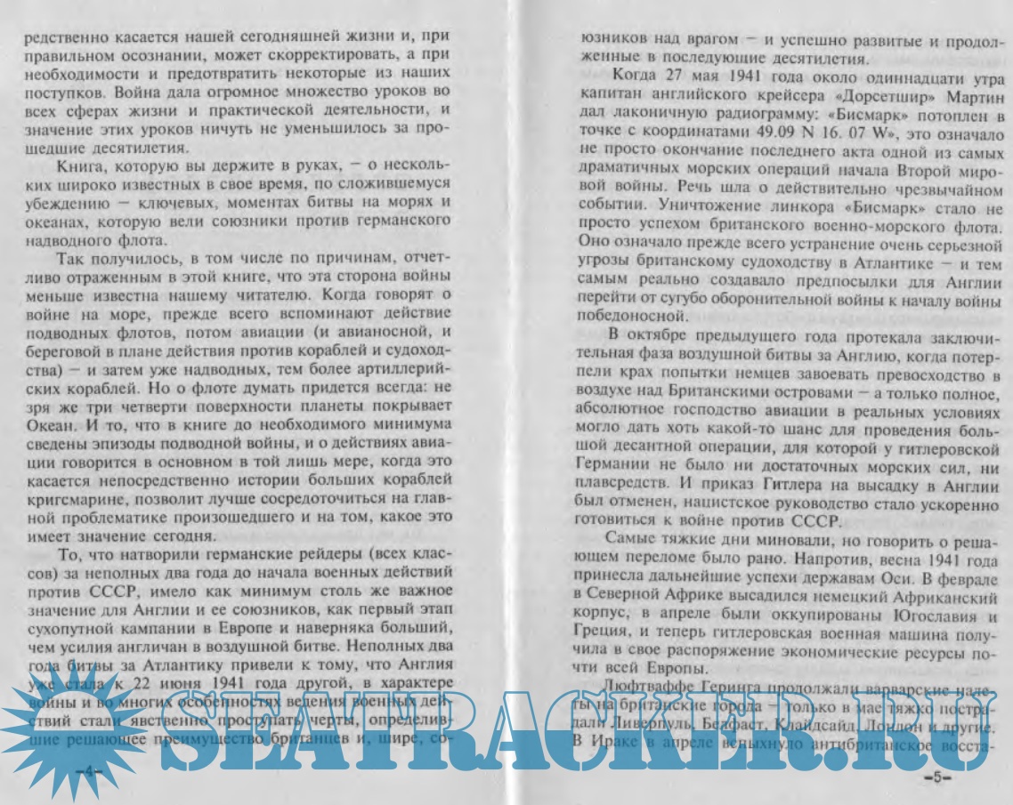Описание: Некоторые драматичные страницы войны на море во время Второй мировой войны слабо освещены в отечественной литературе. Создав мощный военно-морской флот, фашистская Германия бросила вызов `владычице морей` - Великобритании. Британскому Адмиралтейству пришлось приложить отчаянные усилия, чтобы нейтрализовать, а затем и устранить опасность, исходившую от германских линкоров и крейсеров. Именно об этом, о потоплении `Бисмарка` и охоте на `Тирпиц`, о морских сражениях, героизме моряков и трагедии людей, ставших заложниками преступной политики, рассказывают авторы этой книги.