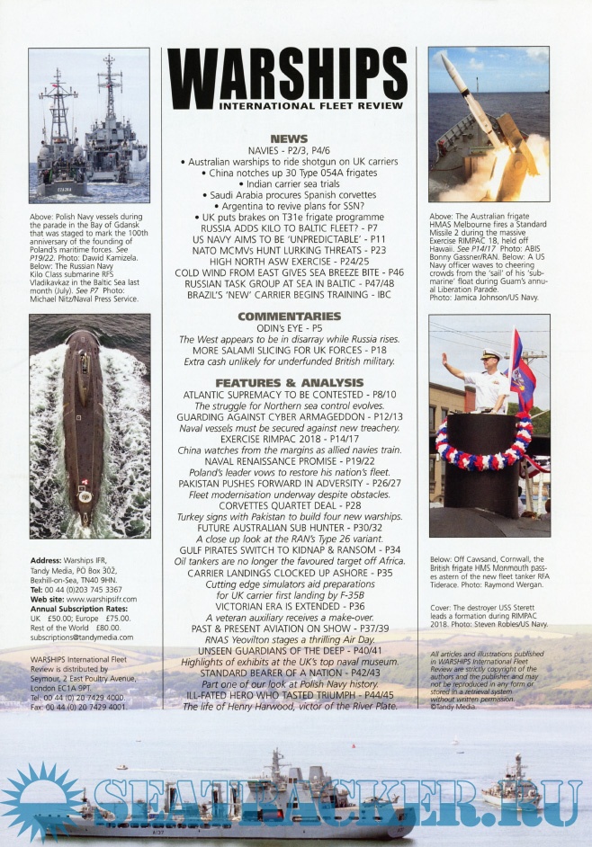 Description: Warships IFR puts the spotlight on the latest developments in the world’s navies. It covers current defence issues and has comments by leading analysts. The magazine regularly includes features on the Royal Navy and the US Navy in addition to incorporating news and features on all other navies across the globe. Warships IFR frequently carries in-depth articles on naval heritage.WARSHIPS International Fleet Review is published 12 times a year by Tandy Media Ltd who also publish Shipping Today & Yesterday (which provides news and features from the world of merchant shipping).