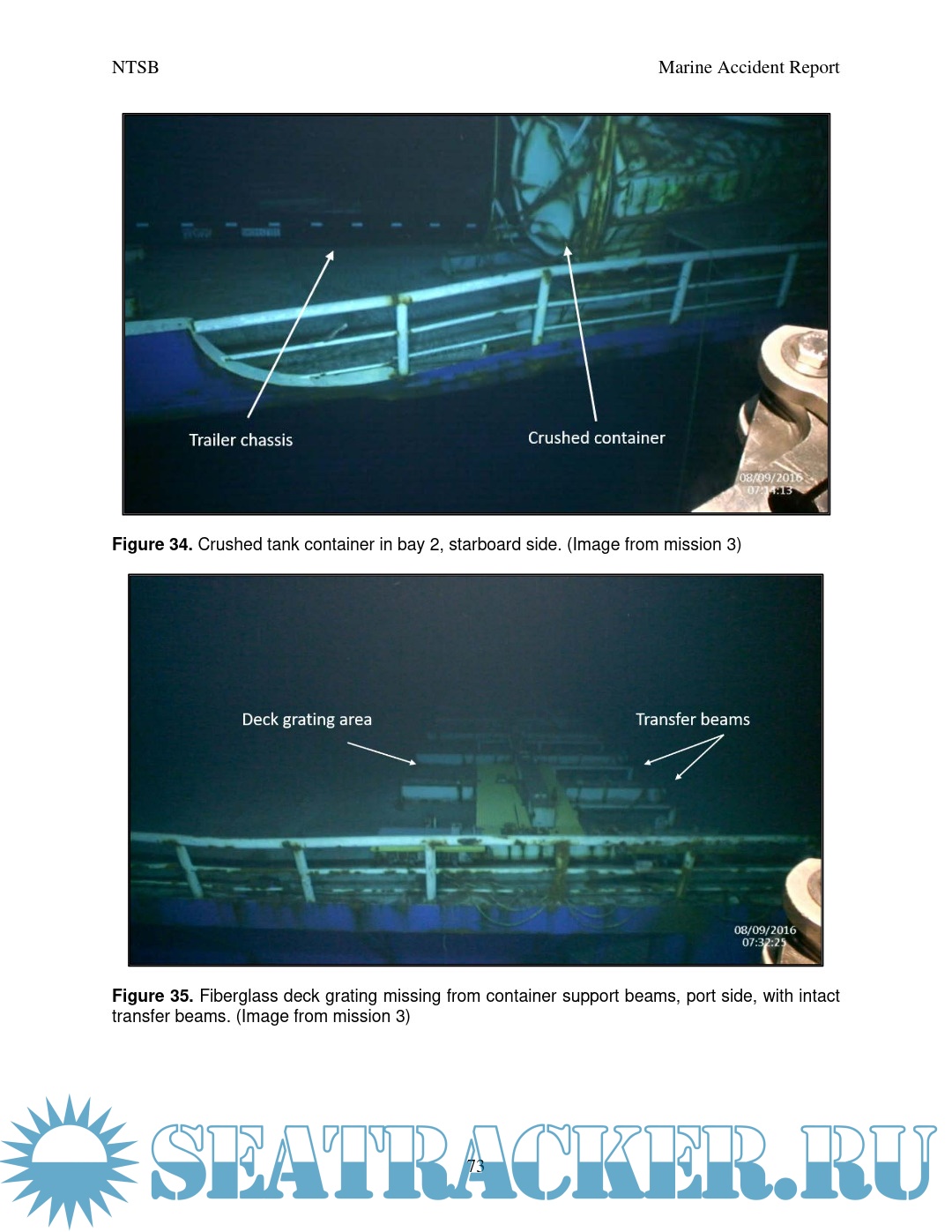 Description: On Thursday, October 1, 2015, the SS El Faro, a 40-year-old cargo ship owned by TOTE Maritime Puerto Rico and operated by TOTE Services, Inc., was on a regular route from Jacksonville, Florida, to San Juan, Puerto Rico, when it foundered and sank in the Atlantic Ocean about 40 nautical miles northeast of Acklins and Crooked Island, Bahamas. The ship had sailed directly into the path of Hurricane Joaquin, carrying a crew of 33, including 5 Polish contract repair workers. All those aboard perished in the sinking. As part of its accident investigation, the National Transportation Safety Board (NTSB) led a joint effort with the US Navy, Woods Hole Oceanographic Institution, and the National Science Foundation to locate the ship’s wreckage and retrieve its voyage data recorder (VDR). The VDR was pulled from 15,250 feet below the ocean surface in August 2016 during the third undersea mission and yielded more than 26 hours of parametric data and audio files. The NTSB’s accident investigation identified the following safety issues: captain’s actions, use of noncurrent weather information, late decision to muster the crew, ineffective bridge resource management, inadequate company oversight, company’s safety management system, flooding in cargo holds, loss of propulsion, downflooding through ventilation closures, need for damage control plan, and lack of appropriate survival craft. The NTSB made safety recommendations to the US Coast Guard; the Federal Communications Commission; the National Oceanic