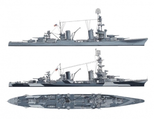 Description: Designed and produced under the regulations of the Washington Naval Treaty, the heavy cruisers of the Pensacola, Northampton, Portland, New Orleans and Wichita classes were exercises in compromise. While they possessed very heavy armament – the Pensacolas, for example, carrying a main battery of ten 8” guns – this came at the cost of protection – armor was the same thickness as a gun cruiser, and incapable of protecting the vessels from enemy 8” fire. As the classes evolved, these flaws began to be corrected, with the main battery being reduced, and increased protection being added to the vital areas of the ship. Despite these drawbacks, the pre-war heavy cruiser classes served with distinction throughout World War II.