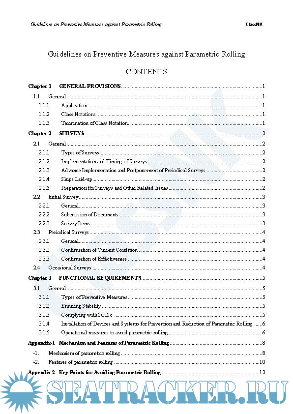 Year: 2024 Language: English Author: ClassNK Genre: Guide Edition: Edition 1.1 (July 2024) Format: PDF Quality: eBook Pages count: 47 Description: The International Maritime Organization (IMO) issued “Interim Guidelines on the Second Generation Intact Stability Criteria” – MSC.1/Circ.1627 (hereinafter, SGISc), which specifies criteria for assessing vulnerability to parametric rolling. A variety of measures for avoiding parametric rolling have also been developed and recommended, including preparation of tables and polar charts of predicted parametric roll response, installation of rolling reduction devices, such as anti-roll tanks, and introduction of parametric rolling alert systems. In recent years, cargo collapse accidents that are thought to have been caused by parametric rolling have occurred successively in large containerships and car carriers, including an accident in which more than 2,000 containers were lost or damaged. In response to this situation, various organizations, institutions and groups have issued alerts and proposed numerous measures related to parametric rolling. It would be our great pleasure if these Guidelines could provide useful information and contribute to preventive measures against parametric rolling.