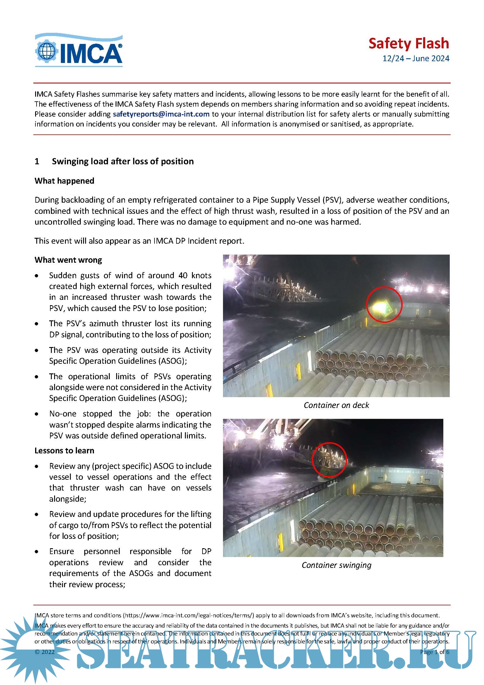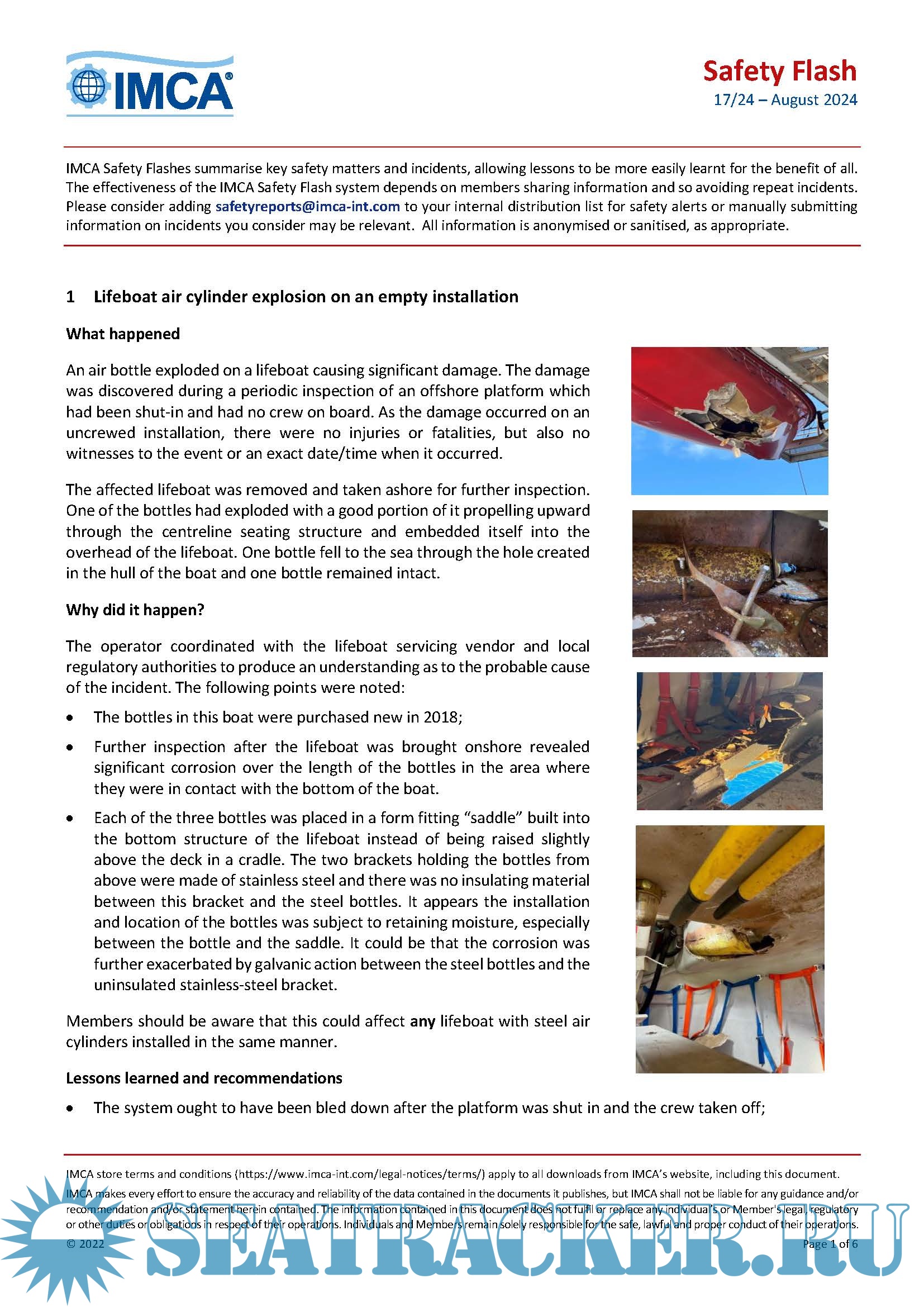 Description: The International Marine Contractors Association ( IMCA ) Safety Flashes disseminate important information on incidents and potential hazards and the lessons learnt from them that can help prevent incidents occurring elsewhere in the industry.