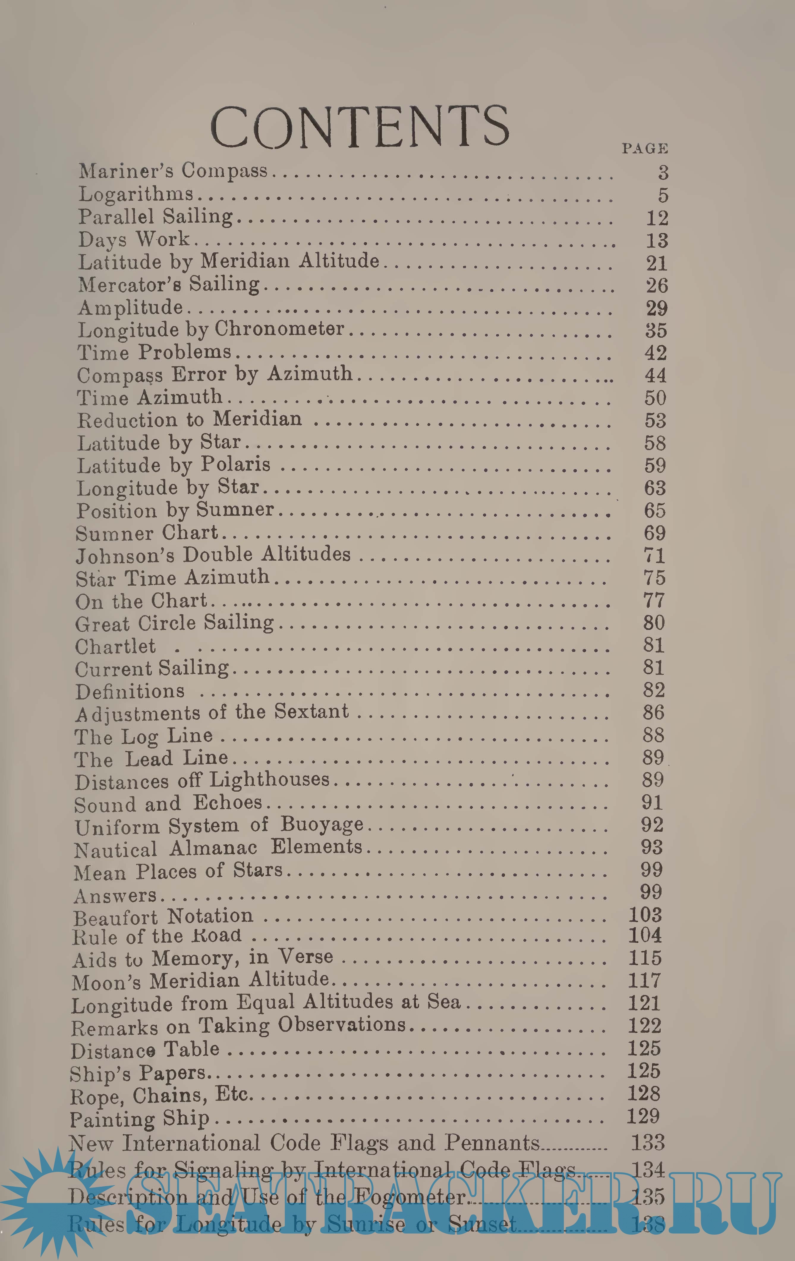 Year: 1912 Language: English Author: Smith W. J. Genre: Practical guide Publisher: by Author Edition: 3rd Format: PDF Quality: Photos of pages Pages count: 150 Description: The Self-instructor in Navigation: And Practical Guide to the Examinations of the U.S. Government Inspectors for Masters and Mates of Ocean Going Steamships and Sailing Vessels. Owing to increased demand for "Self-Instructor" this Third Edition is published, and the Author expresses his heartiest gratitude to the N·avigator, by whose appreciation of the Book as a real "help in times of need" another edition has been made possible. Thanks indeed to the Nautical Fraternity, Self-Instructor now wears an additional stripe on its uniform. The volume is based on a life study and observation in all climes, and under all circumstances; at the same time, ideas gleaned from nautical men of repute have not teen left out; and the simplest possible language has been used in explaining the various problems, and stating the rules for working thern.