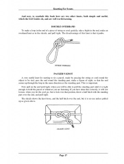 Year: 1954 Language: English Author: Genese W.J. Genre: Manual Publisher: The boy scouts association Format: PDF Quality: eBook Pages count: 17 Description: This document provides instructions for tying several basic knots that are required as part of Boy Scout proficiency tests. It begins with an introduction to the importance of knot tying and some of Baden-Powell's thoughts on the topic. It then provides step-by-step instructions on how to perform a simple whipping to prevent rope ends from unraveling, which is part of the Tenderfoot level testing requirements. Additional knots that are covered for Tenderfoot level include the reef knot, sheet bend, clove hitch, bowline, round turn and two half hitches, sheepshank, and double overhand.