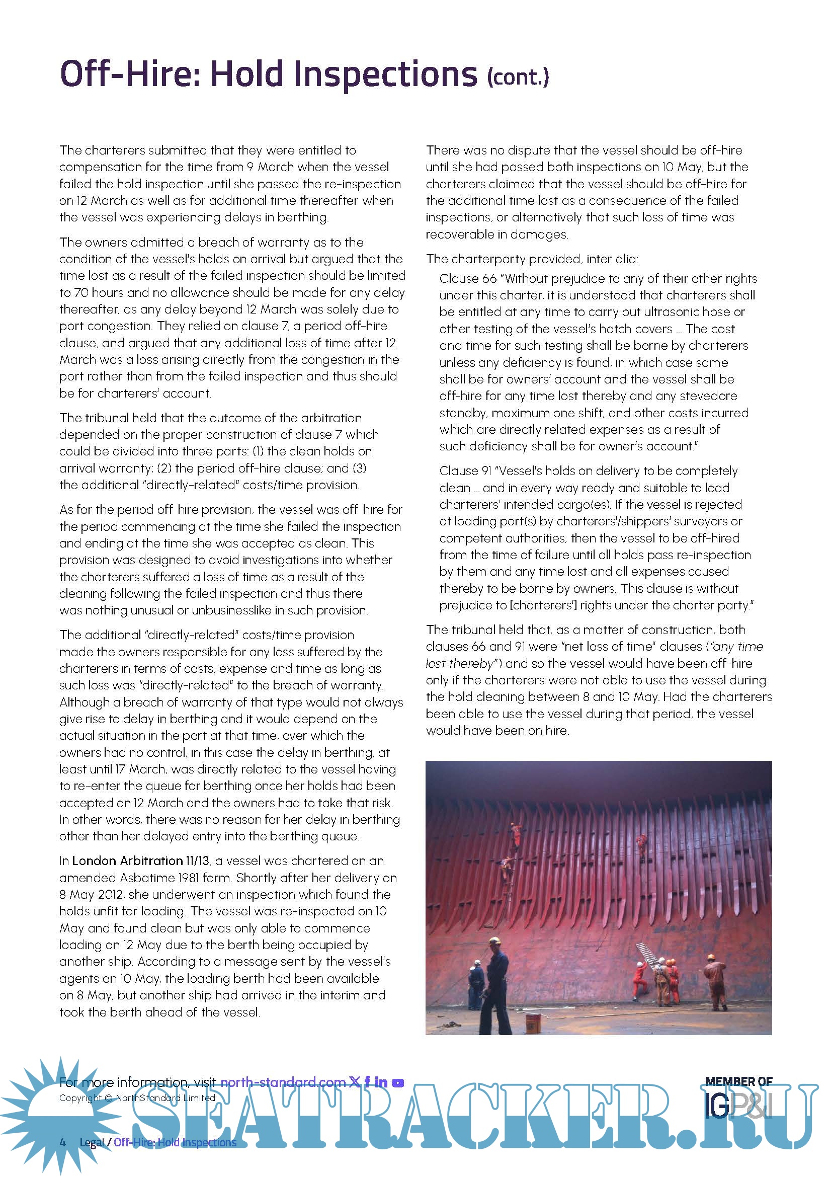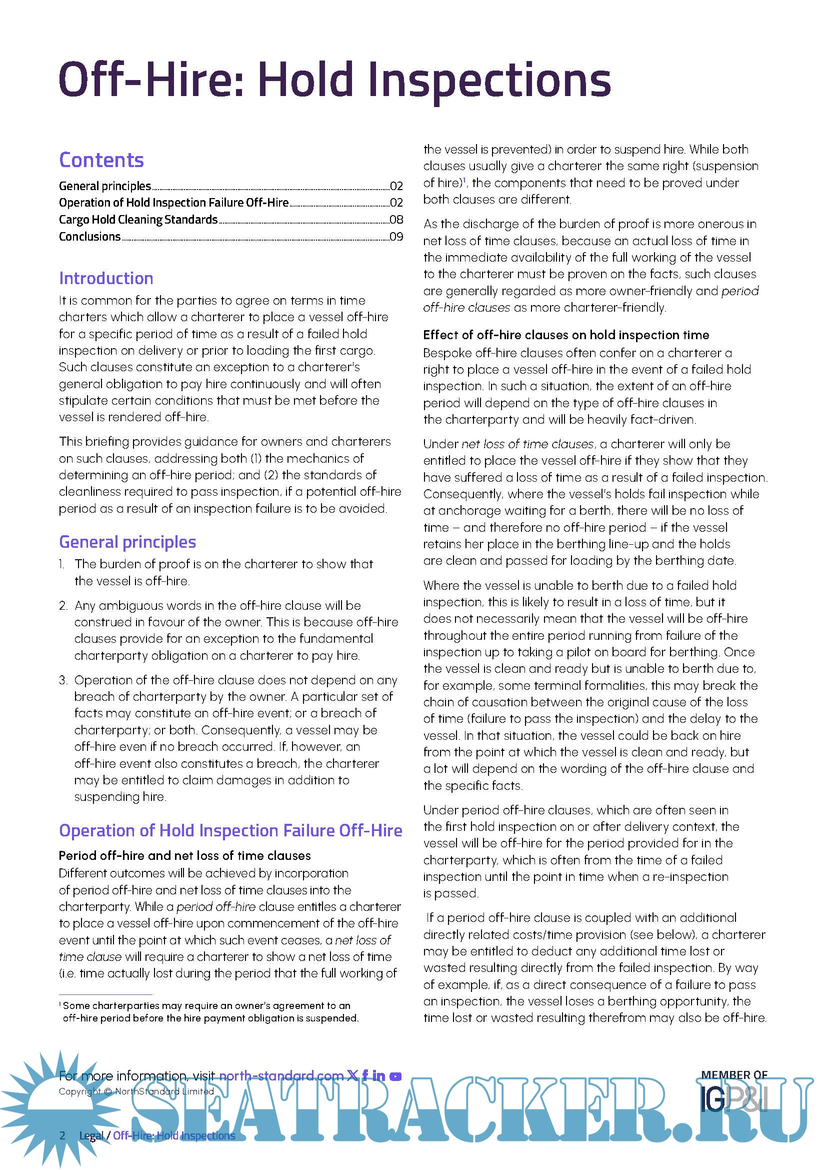 Year: 2024 Language: English Author: NorthStandard Genre: Practical guide Edition: September 2024 Format: PDF Quality: eBook Pages count: 11 Description: It is common for the parties to agree on terms in time charters which allow a charterer to place a vessel off-hire for a specific period of time as a result of a failed hold inspection on delivery or prior to loading the first cargo. Such clauses constitute an exception to a charterer’s general obligation to pay hire continuously and will often stipulate certain conditions that must be met before the vessel is rendered off-hire. This briefing provides guidance for owners and charterers on such clauses, addressing both (1) the mechanics of determining an off-hire period; and (2) the standards of cleanliness required to pass inspection, if a potential off-hire period as a result of an inspection failure is to be avoided.