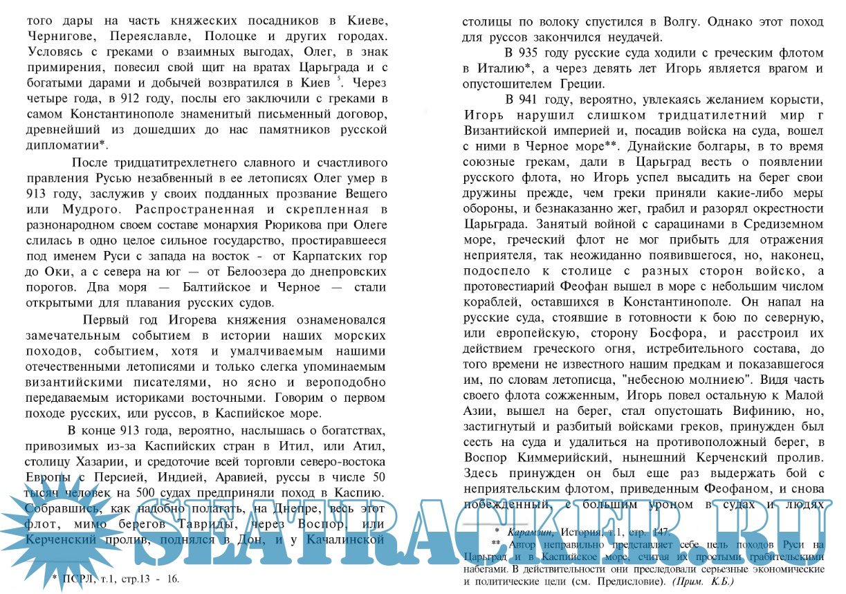 Год выпуска: 1994 Язык: Русский Автор: Висковатов А. В. Жанр: Историческое Издательство: БРАСК Формат: DjVu Качество: Отсканированные страницы Количество страниц: 206 Описание: Важнейшим достоинством книги Висковатова является то, что автор широко использовал доступные ему русские и иностранные первоисточники. Среди русских источников первое место по обилию и ценности материала занимают летописи. Автор имел возможность воспользоваться вышедшими к моменту окончания работы первыми шестью томами “Полного собрания русских летописей”, издававшихся Археографической комиссией: Лаврентьевским, Ипатьевским, Новгородскими, Псковскими и Софийскими летописными сводами. Кроме того, он использовал также в изданиях конца XVIII века и начала XIX века Никоновскую летопись, Архангелогородскую и Двинскую. Очень полно в работе представлены византийские источники, в большинстве случаев не переведенные на русский язык: Георгий Амартол, Зонара, Симеон Логофет, Кедрин и др. С восточными источниками, содержащими сведения о руссах, автор ознакомился по работам выдающегося ориенталиста Френа. Использование этих источников дало возможность автору впервые раскрыть не известные ранее страницы русской истории.