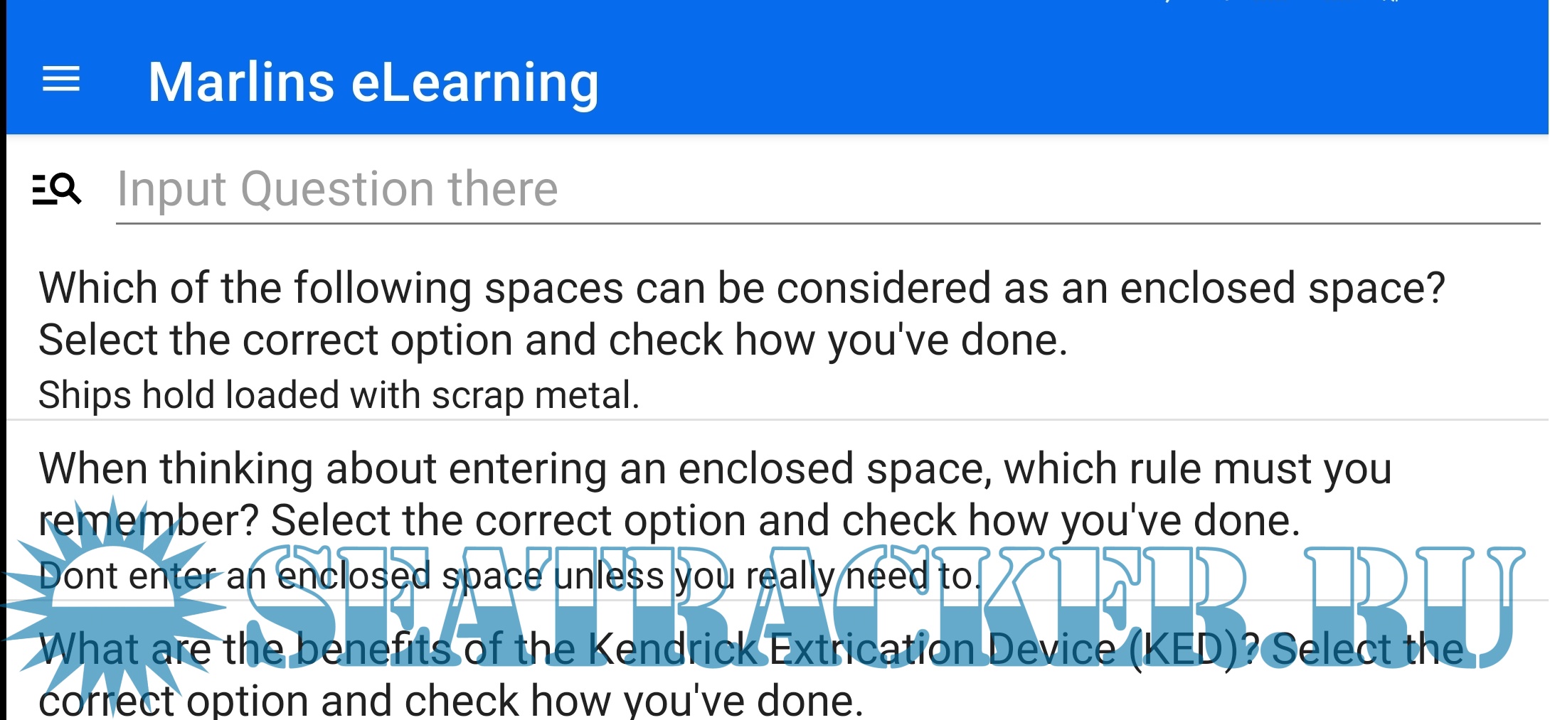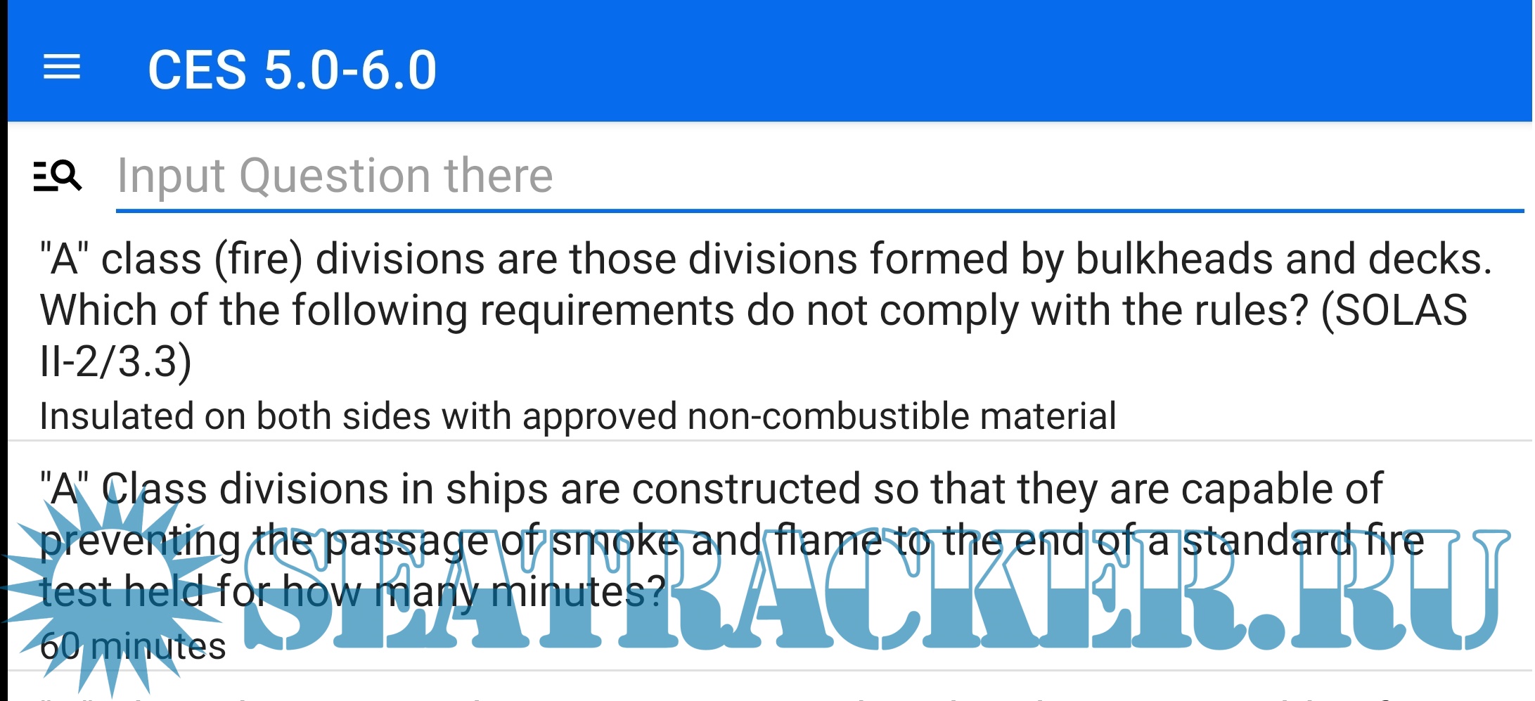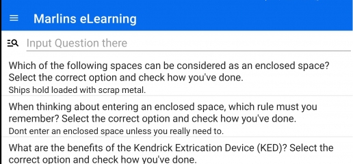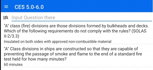 Year: 2024 Version: 5.0 Developer: Nirex Platform: Android Localization: English Crack: Not needed Description: A collection of answers to marine tests: Сборник ответов на тесты для моряков - CES 4.1 - CES 5.0-6.0 - Sets 6000 - Examiner / Crew 2002 - SEEMP (Ship Energy Efficiency Management Plan) - Marlins eLearning В программе содержится полная база ответов с поиском по коду и по части вопроса. The program contains a complete database of answers with the search code and part of the question. Additional info: Это программа шпаргалка, создана для помощи в прохождении тестов. Работает все просто, в тестах CES и SETS каждому вопросу присвоен свой уникальный код, который и надо вводить. В других тестах поиск происходит по части вопроса. При запуске программы вся база ответов не загружается в память, потому что это больше 30 000 строк, представте как будет притормаживать телефон или планшет при работе с таким массивом данных :) Поэтому при запуске программы Вы не видите ответов, они появятся только после поиска.Например, при сдаче SETS, в правом верхнем углу будет номер вопроса HMS1000000000007745. В поисковую строку достаточно ввести 45 и получите все ответы код вопроса которых содержит 45, для более точного поиска необходимо ввести 7745. Короче, чем конкретнее условие поиска - тем точнее будет поиск. You may direct thank to Developer with opening link above