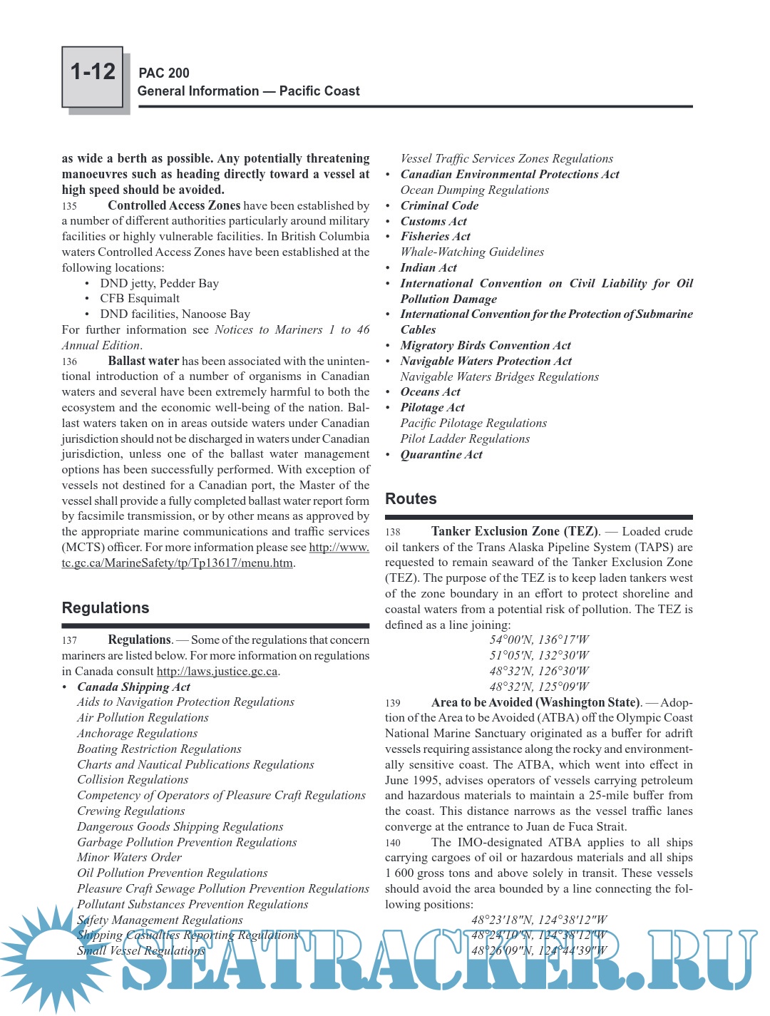 Year: 2021 Language: English Author: Fisheries and Oceans Canada Genre: Atlas Publisher: Fisheries and Oceans Canada Format: PDF Quality: eBook Pages count: 113 Description: The Second Edition of 2006, has been fully updated from Canadian Government and other information sources. In general, all hydrographic terms used in this booklet are in accordance with the mean Sailing Directions, PAC 200 — General Information, Pacific Coastings given in the Hydrographic Dictionary (Special Publication No. 32), published by the International Hydrographic Bureau. General information for the British Columbia coast is given in this booklet. It contains navigational information and a brief description of the main port facilities as well as geographic, oceanographic and atmospheric characteristics. Detailed descriptions of geographical areas are given in a series of booklets. Their limits are printed on the back cover. The appropriate descriptive booklet(s) of Sailing Directions should be consulted in conjunction with this PAC 200 — General Information booklet. Tide and current information revised by the Canadian Hydrographic Service. Meteorological information supplied by the Atmospheric Environment Service, Environment Canada. Photographs by the Canadian Hydrographic Service unless otherwise indicated.