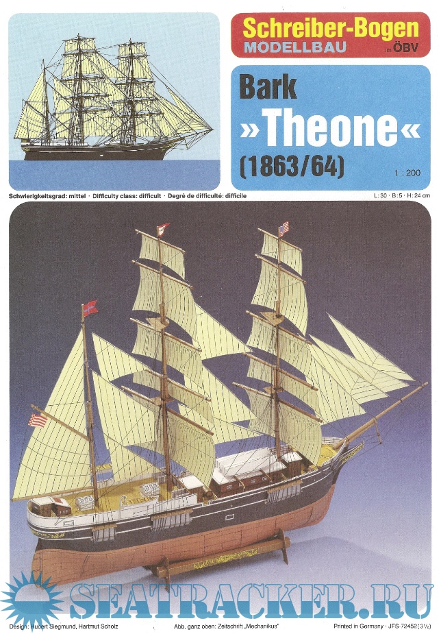 Описание: 9 листов цветных выкроек и инструкций для изготовления бумажной модели барка "Theone" 1863 год в масштабе 1:200