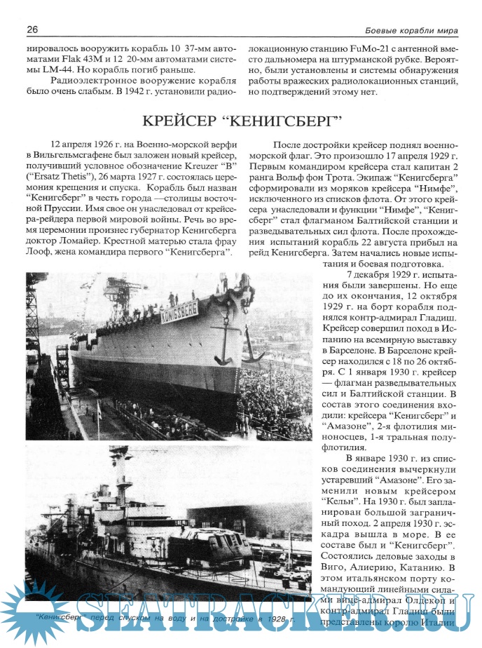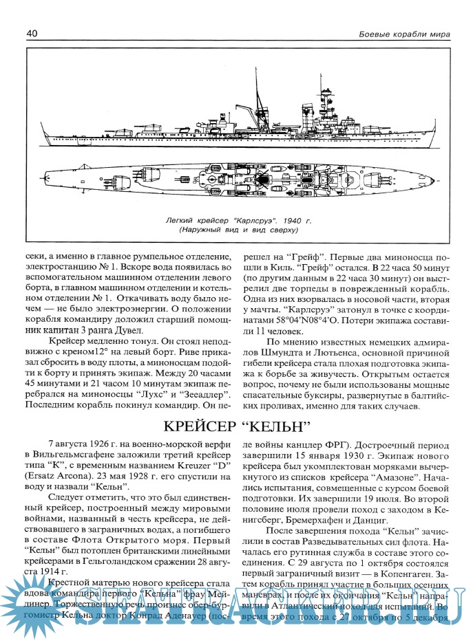 Год выпуска: 2003 Язык: Русский Автор: С.Б.Трубицын Жанр: Историческое Издательство: АНТ-Принт Издание: Серия "Боевые корабли мира" Формат: PDF Качество: Отсканированные страницы Количество страниц: 112 Описание: Эта книга повествует о лёгких крейсерах Кригсмарине таких, как «Эмден»(Emden), «Кёнигсберг»(Konigsberg), «Карлсруэ»(Karlsruhe) и «Кёльн»(Koln). В книге подробно описаны история создания, боевого применения лёгких крейсеров Германии в период с 1921 по 1945 год. Книга содержит большое количество чертежей, схем и уникальных фотографий.