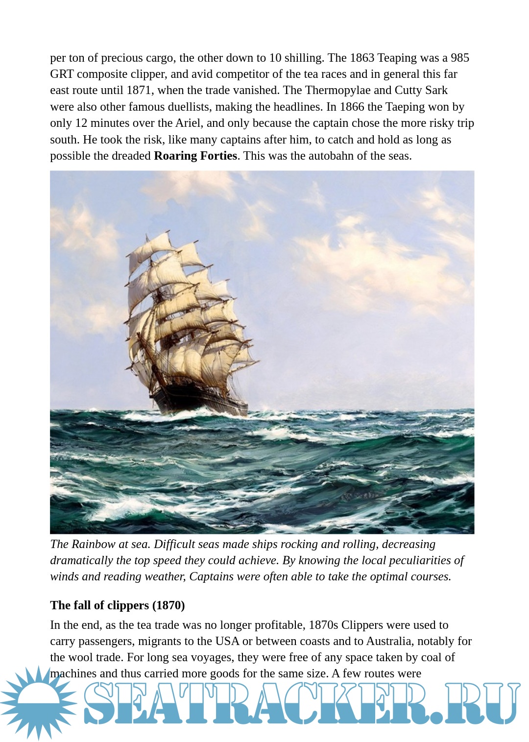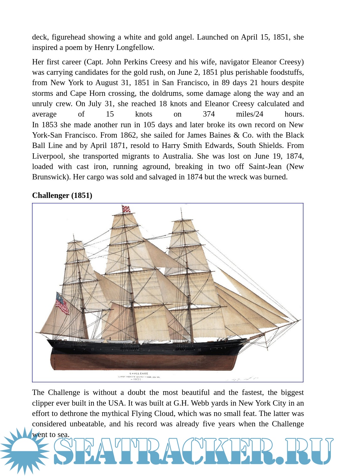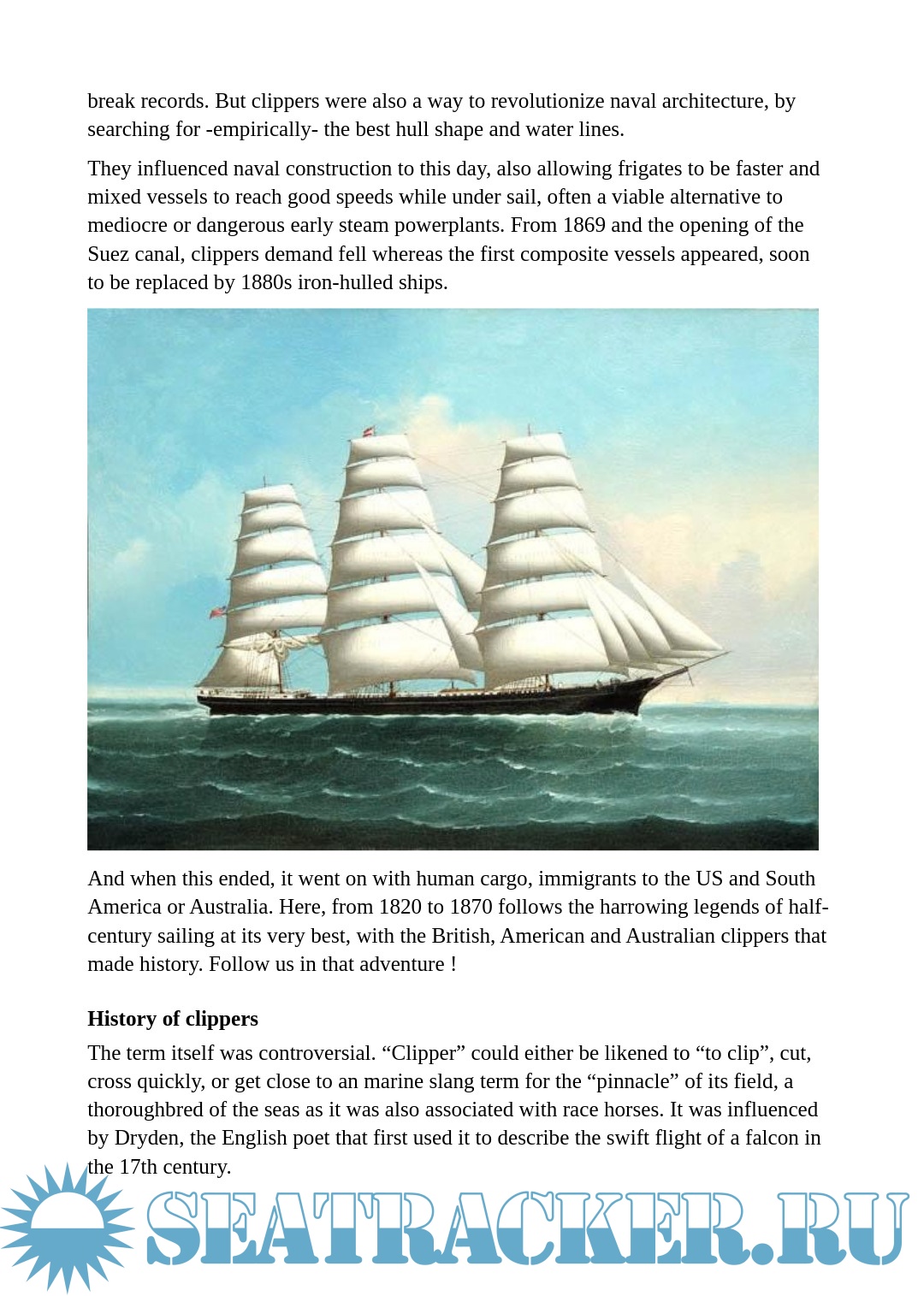 Description: The term itself was controversial. “Clipper” could either be likened to “to clip”, cut, cross quickly, or get close to an marine slang term for the “pinnacle” of its field, a thoroughbred of the seas as it was also associated with race horses. It was influenced by Dryden, the English poet that first used it to describe the swift flight of a falcon in the 17th century.