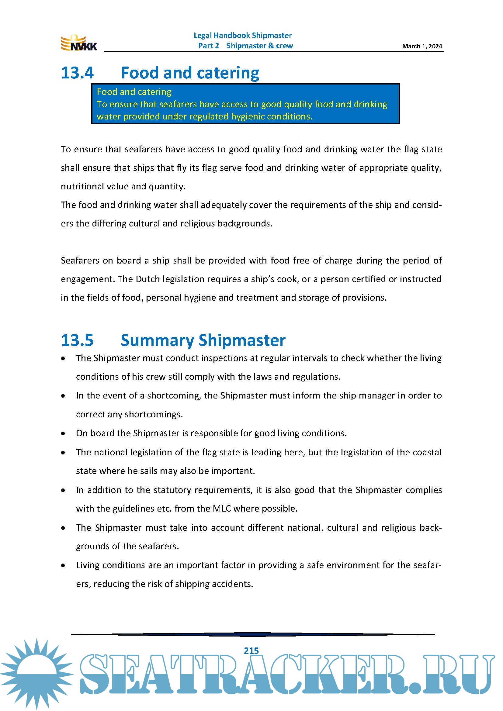 The Shipmaster must deal with both national and international legislation which applies on all seagoing vessels sailing under the flag of the Kingdom of the Netherlands. Therefore, the purpose of this handbook is to provide a good insight regarding national and international laws and regulations. The book focuses primarily on the safety of the vessel, the crew, the environment, and cargo operations.