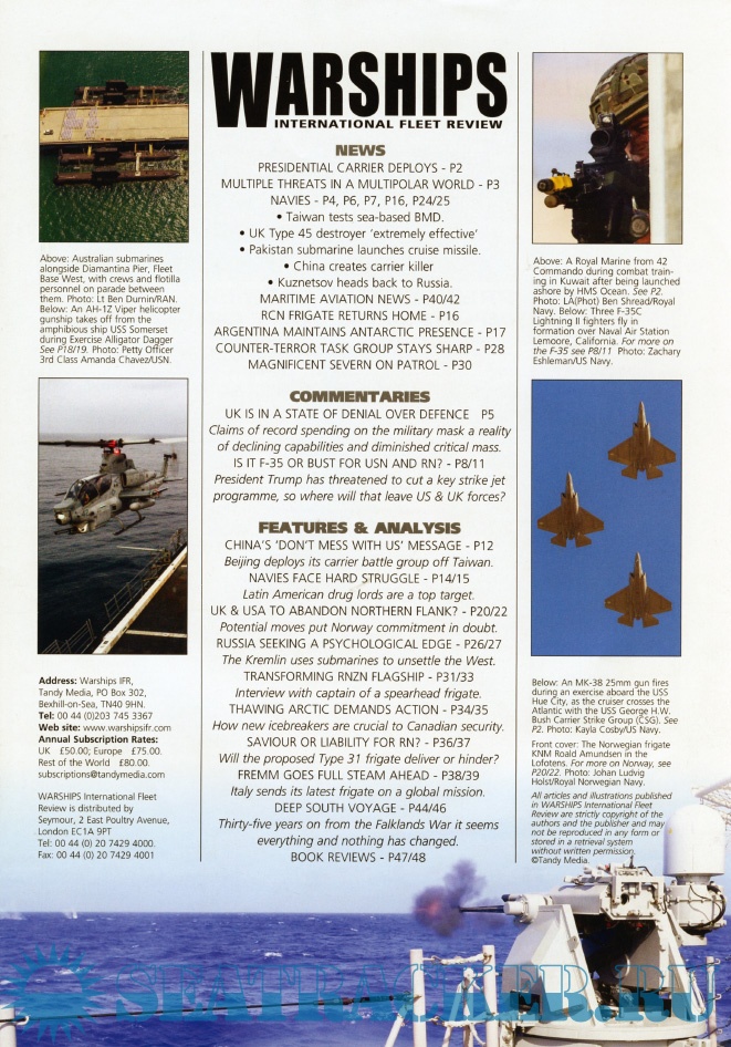 Description: Warships IFR puts the spotlight on the latest developments in the world’s navies. It covers current defence issues and has comments by leading analysts. The magazine regularly includes features on the Royal Navy and the US Navy in addition to incorporating news and features on all other navies across the globe. Warships IFR frequently carries in-depth articles on naval heritage.WARSHIPS International Fleet Review is published 12 times a year by Tandy Media Ltd who also publish Shipping Today & Yesterday (which provides news and features from the world of merchant shipping).