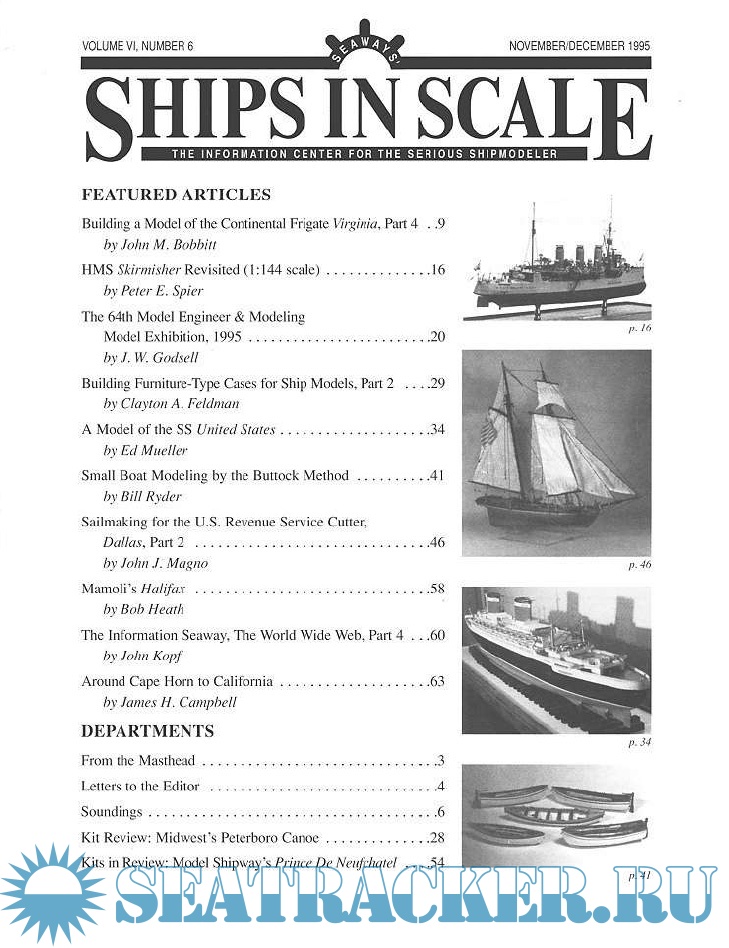 Year: 1995 Language: English Author: Scottie Dayton (Editor) Genre: Periodical publication Edition: 1995-6 Format: PDF Quality: Scanned pages Pages count: 76 Description: Seaway is the home port for Seaways Ships in Scale magazine, the leading workshop and research magazine for the ship modeler. In the magazine we explore all levels of modeling experience, all types of ships, all kinds of models, all historical eras and all construction materials