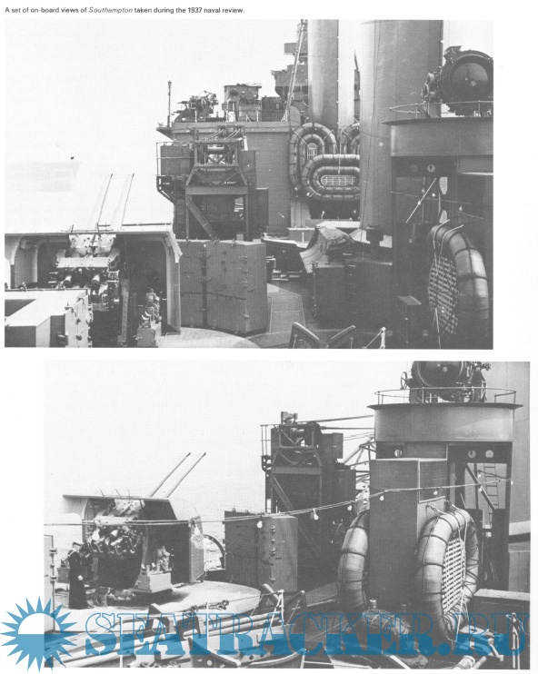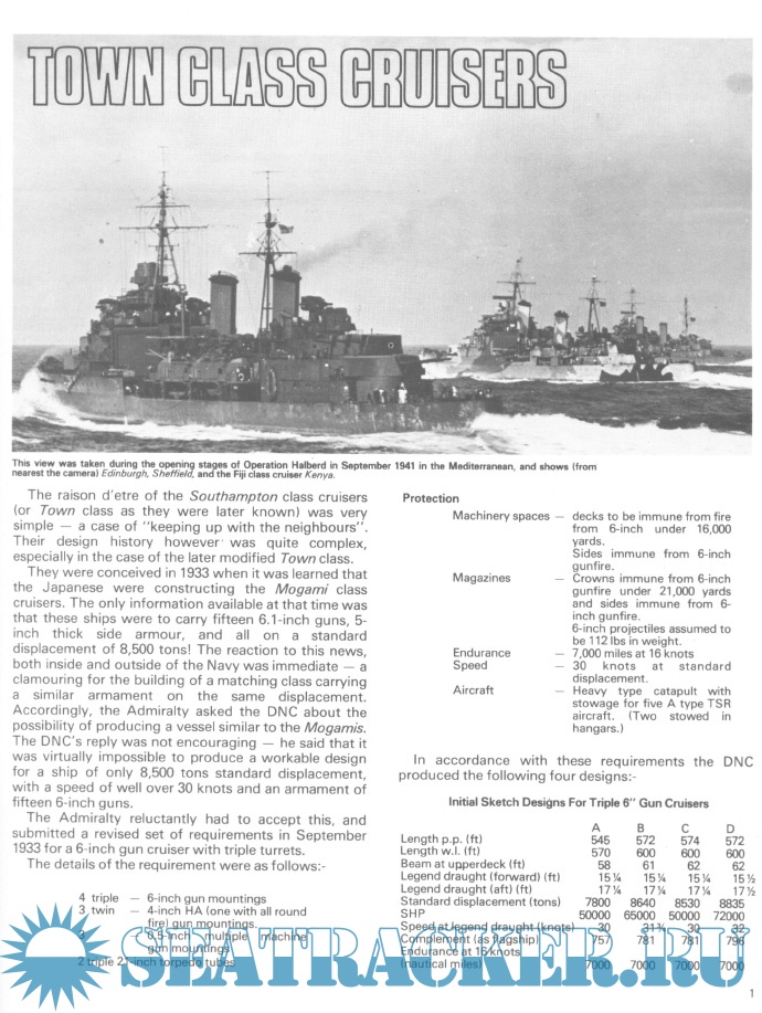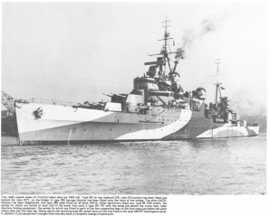 Description: The raison d’etre of the Southampton class cruisers (or Town class as they were later known) was very simple – a case of “keeping up with the neighbours”. Their design history however’ was quite complex, especially in the case of the later modified Town class. They were conceived in 1933 when it was learned that the Japanese were constructing the Mogami class cruisers. The only information available at that time was that these ships were to carry fifteen 6.1-inch guns, 5-inch thick side armour, and all on a standard displacement of 8,500 tons! The reaction to this news, both inside and outside of the Navy was immediate – a clamouring for the building of a matching class carrying a similar armament on the same displacement. Accordingly, the Admiralty asked the DNC about the possibility of producing a vessel.