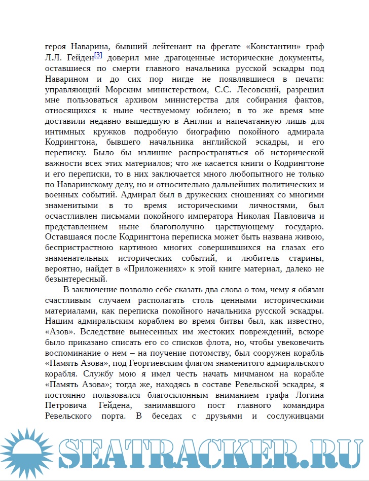 Год выпуска: 2019 Язык: Русский Автор: Богданович Е.В. Жанр: Историческое Издательство: ВЕЧЕ Формат: PDF Качество: Изначально компьютерное (eBook) Количество страниц: 478 Описание: В книге представлены две исторические работы генерала от инфантерии, писателя Евгения Васильевича Богдановича (1829-1914). Первая работа посвящена Наваринскому морскому сражению 1827 года между соединённой эскадрой России, Англии и Франции, с одной стороны, и турецко-египетским флотом - с другой. Разгром турецкого флота в этом сражении значительно ослабил морские силы Турции, что послужило важным вкладом в победу России в дальнейшей Русско-турецкой войне 1828-1829 годов. Второе исследование рассказывает о разгроме турецкой эскадры Черноморским флотом под командованием вице-адмирала Павла Степановича Нахимова 18 (30) ноября 1853 года в гавани города Синоп на черноморском побережье Турции. В историографии русского флота работы Е.В. Богдановича по праву считаются классическими.