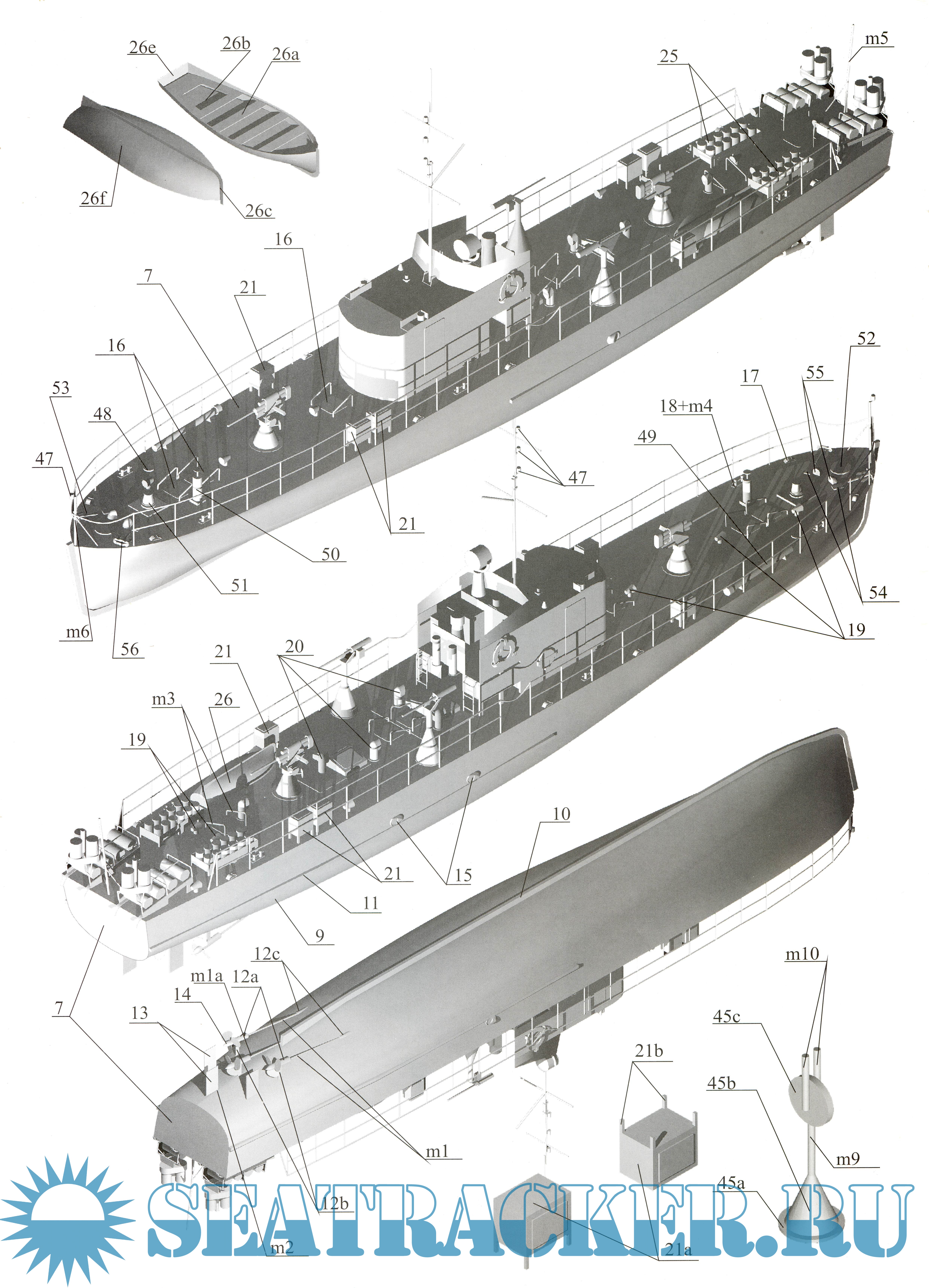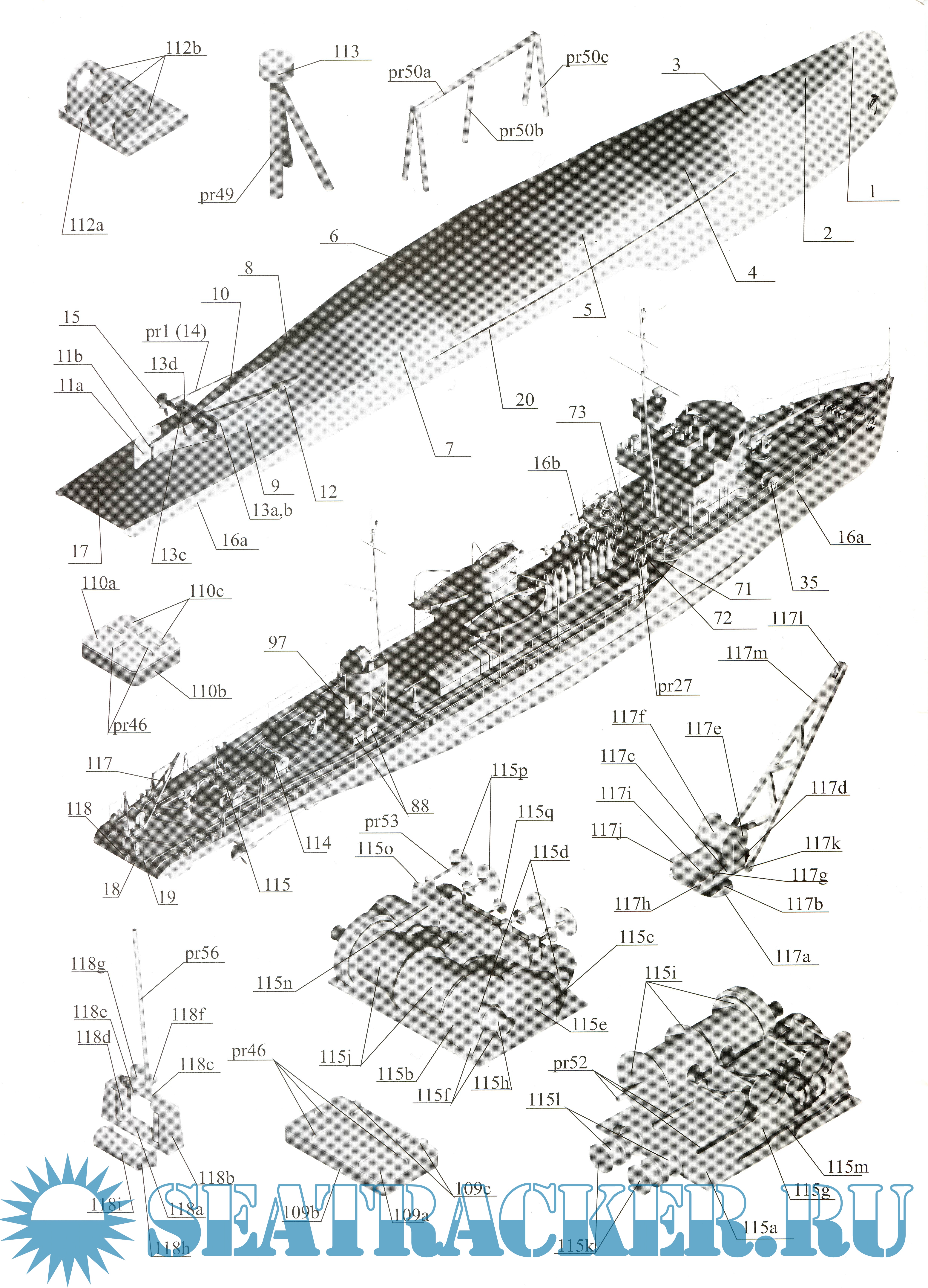 16 лисов цветных выкроек и инструкций для изготовления бумажной модели морского охотника МО-4 1942 год в масштабе 1:100