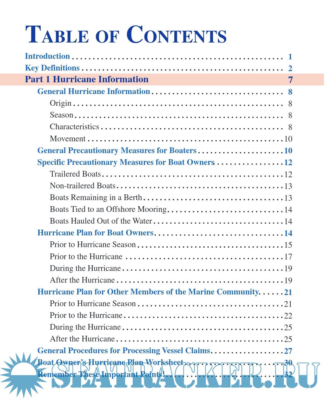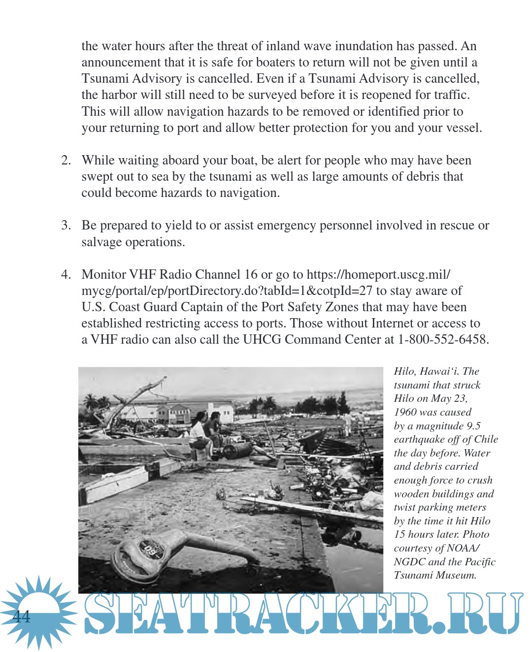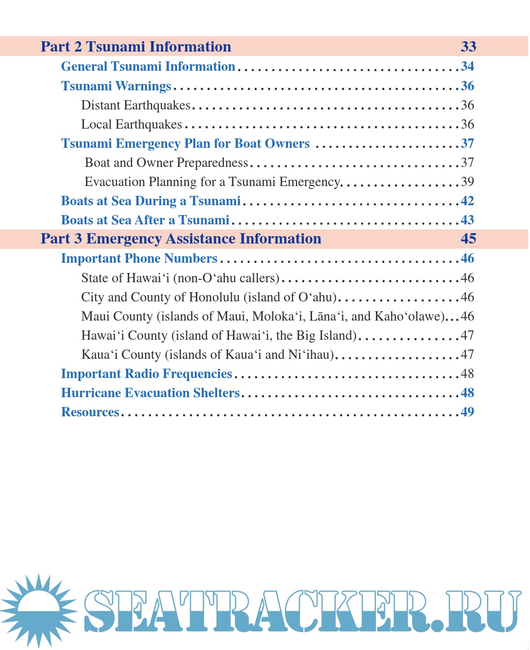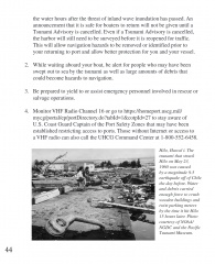 Description: This updated manual provides a summary of the actions boaters and other members of Hawai‘i’s marine community can take before, during, and after a hurricane or tsunami. It is intended to assist in preparing for and mitigating the effects of these hazards. It includes information on these events and their dangers, provides guidelines to develop a personal preparedness plan, and lists emergency assistance information (that is, phone numbers, radio frequencies, and hurricane evacuation shelter locations). The statements and procedures contained in this manual may be modified or supplemented to meet the specific needs of individual boat owners. It is intended that this manual complement state statutes, Hawai‘i administrative rules, county codes and ordinances, whose provisions shall prevail in the event of a conflict.