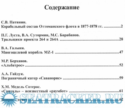 Описание: Представлены справочник по корабельному составу Оттоманского флота период русско-турецкой войны 1877-1878 гг.; статьи по малоизвестной серии советских послевоенных тральщиков, немецким многоцелевым кораблям типа MZ, итальянскому противолодочному кораблю «Альбатрос» и другие материалы.