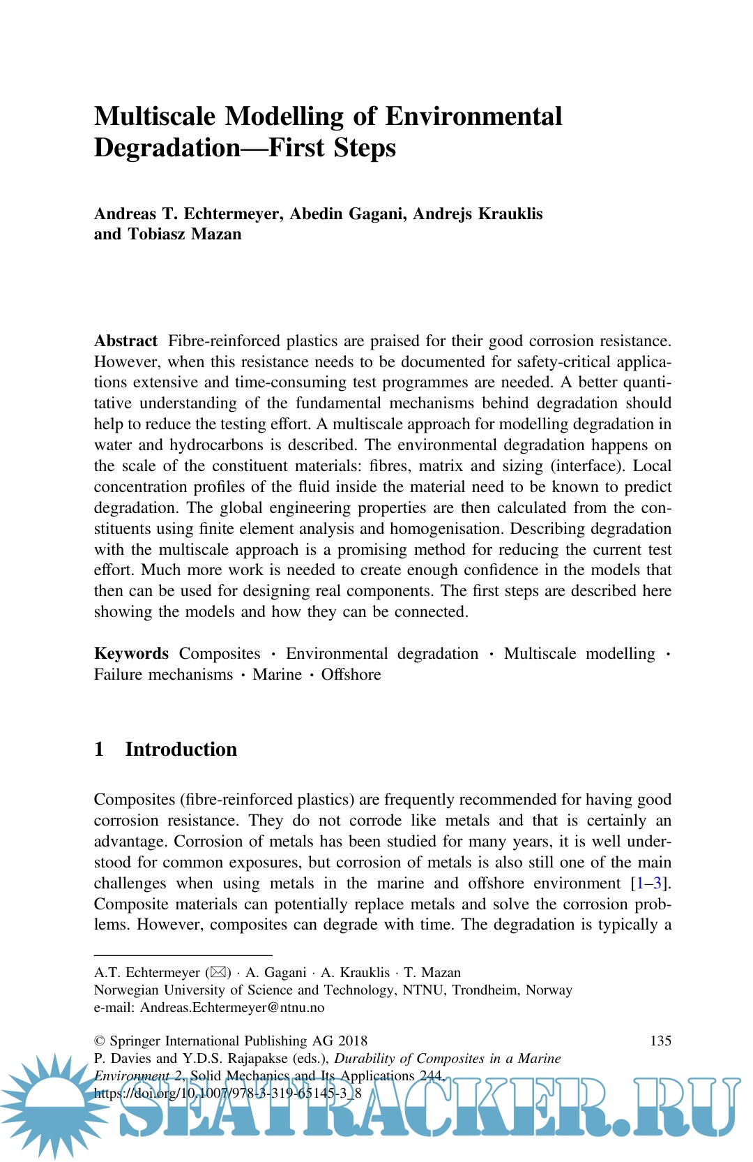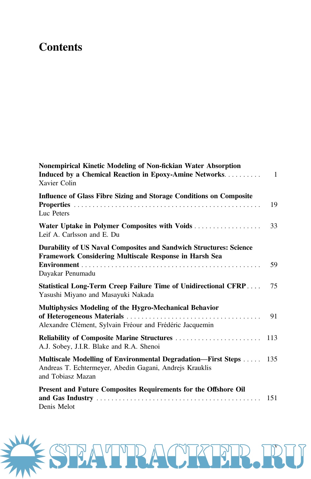 Year: 2018 Language: English Author: Davies P., Rajapakse Y.D.S. Genre: Technical book Publisher: Springer ISBN: 978-3-319-65144-6, 978-3-319-65145-3 Format: PDF Quality: eBook Pages count: 242 Description: While fibre-reinforced polymer composites have a long history in marine applications (pleasure boats, military ships, submarines), durability aspects are rarely explicitly integrated in design. There have been some attempts to address this in European projects and within the ONR Solid Mechanics program, but we are only starting to include key aspects such as coupling between water ingress and mechanical behaviour. This is a new research area, made possible by the development of computing power; it requires a close collaboration between researchers with experience of materials in a marine environment and modellers developing predictive tools, in order to provide naval architects with validated long-term behaviour models.