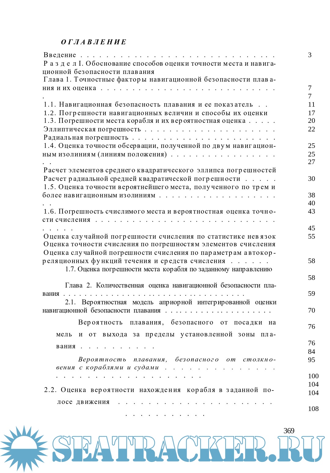 Год выпуска: 2002 Язык: Русский Автор: Груздев Н.М. Жанр: Учебное пособие Издательство: Высшие специальные офицерские классы Военно-морского флота Формат: PDF Качество: Изначально компьютерное (eBook) Количество страниц: 369 Описание: Введение. Обоснование способов оценки точности места и навигационной безопасности плавания. Точностные факторы навигационной безопасности плавания и их оценка. Навигационная безопасность плавания и ее показатель. Погрешности навигационных величин и способы их оценки. Погрешности места корабля и их вероятностная оценка. Оценка точности обсервации, полученной по двум навигационным изолиниям (линиям положения). Оценка точности вероятнейшего места, полученного по трем и более навигационным изолиниям. Погрешность счислимого места и вероятностная оценка точности счисления. Оценка погрешности места корабля по заданному направлению. Количественная оценка навигационной безопасности плавания. Вероятностная модель априорной интегрированной оценки навигационной безопасности плавания. Оценка вероятности безопасного положения корабля в узкости. Оценка вероятности безопасного положения корабля в прибрежной зоне и в открытом море. Оценка безопасности расхождения кораблей. Маневр расхождения для предупреждения столкновения. Оценка безопасности корабля на фарватере при нахождении на нем встречного корабля. Оценка вероятности случайного выхода корабля на встречную полосу движения. Статистический (апостериорный) способ оценки навигационных происшествий. Параметры навигационной безопасности плавания и их допустимые значения. Параметры навигационной безопасности плавания. Допустимые погрешности в месте корабля. Допустимое сближение с навигационной опасностью. Допустимая скорость корабля. Допустимые глубина моря и глубина погружения подводной лодки. Допустимые углы сноса при плавании по узким фарватерам. Допустимые интервалы времени между последовательными обсервациями и между определениями течений. Сводная таблица допустимых параметров навигационной безопасности плавания. Статистические способы контроля надежности навигационной информации и выявления промахов. Задачи и сущность статистического контроля надежности навигационных данных. Контроль и выявление промахов при решении задач обеспечения навигационной безопасности плавания. Контроль надежности работы навигационных систем. Вероятность появления экстремальных погрешностей. Практические приемы и способы обеспечения и контроля навигационной безопасности плавания. Предварительная оценка навигационной безопасности плавания по заданному маршруту. Содержание планирования похода и подготовки к безаварийному плаванию. Методика расчета допустимой и ожидаемой точности плавания для обеспечения навигационной безопасности. Оценка вероятности безопасного плавания по заданному маршруту. Выбор безопасного маршрута движения. Организация, средства и методы обеспечения и контроля навигационной безопасности плавания. Организация штурманской службы корабля при обеспечении и контроле навигационной безопасности плавания. Содержание деятельности штурманской службы по обеспечению и контролю навигационной безопасности плавания. Способы и средства контроля навигационной безопасности плавания в открытом море и при подходе к 