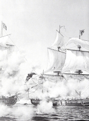 Description: HMS Detroit was a 20-gun sloop of the Royal Navy, launched in July 1813 and serving on Lake Erie during the War of 1812. She was the most powerful British ship in the Lake Erie squadron until the Americans captured her during the Battle of Lake Erie on 10 September 1813. Detroit was commissioned into the United States Navy as its first USS Detroit. However, she was so damaged that the sloop took no further part in the war. Postwar, Detroit was sunk for preservation at Misery Bay of Presque Isle until 1833, when she was refloated and converted for commercial service. In 1841, Detroit was reduced to a hulk at Buffalo, New York, where she was purchased with the intent of sending her over Niagara Falls. The plan went awry and Detroit ran aground on a shoal before the falls and broke up.