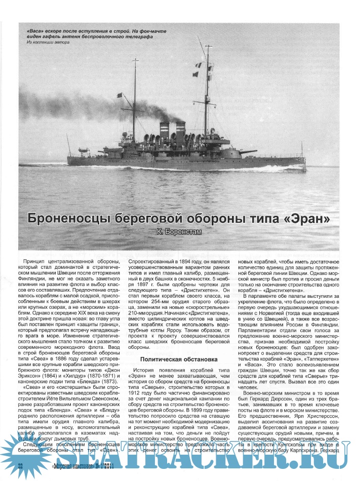 Статья шведского историка Курта Боренстама (Curt Borgenstam) рассказывает о самой многочисленной серии броненосцев береговой обороны этой Скандинавской страны. Перевод с английского выполнил М.Б. Князев, графику - Е. Левандовский (Jerzy Lewandowski, Польша).