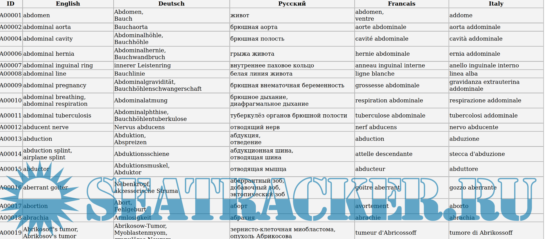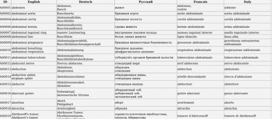 Year: 1998 Language: English, Russian, French, German, Italian Author: Болотина А., Якушева Е., Черняк И. и др. Genre: Dictionary Publisher: РУССО Format: HTML Quality: eBook Pages count: 856 Description: Многоязычный Медицинский словарь. Английский Немецкий Французский Итальянский Русский. (текст в виде таблиц с разметкой HTML) Словарь содержит около 12 000 терминов по всем разделам медицины и смежных естественных наук, в том числе по медицинской генетике, биохимии, иммунологии, космической медицине, организации здравоохранения, медицинской технике. Английские термины в словаре снабжены эквивалентами на немецком, французском, итальянском и русском языках. Словарь содержит указатели немецких, французских, итальянских и русских терминов, с помощью которых легко можно отыскать нужный эквивалент на любом из этих языков. Словарь предназначен для преподавателей и студентов медицинских вузов, специалистов-медиков, переводчиков, а также для широкого круга читателей, интересующихся зарубежной медицинской литературой.