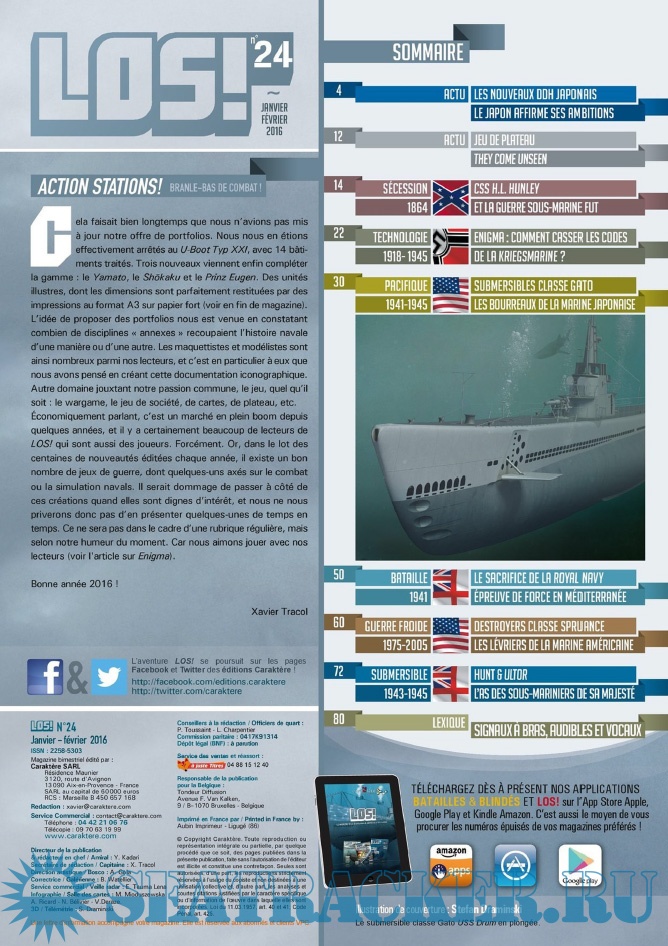 Year: 2016 Language: French Author: Collective Genre: Periodical publication Edition: 2016 01-02 Format: PDF Quality: eBook Pages count: 84 Description: LES ÉDITIONS CARAKTÈRE PRENNENT LE LARGE EN LANÇANT UN NOUVEAU MAGAZINE CONSACRÉ À LA GUERRE NAVALE !Les sujets passionnants ne manquent pas et LOS ! met un point d’honneur à les présenter au lecteur comme cela n’a jamais été fait dans la presse française jusqu’à présent. Un seul mot d’ordre pour l’équipe rédactionnelle : rigueur scientifique et présentation ludique !S’appuyant sur un fond photographique d’exception, sur des plans de bateaux et d’avions, les éditions Caraktère innovent une fois de plus en vous proposant aussi des vues 3D détaillées, le tout au service de textes soigneusement rédigés par des auteurs spécialisés. Vous comprendrez ainsi comment fonctionne un submersible, comment se déroule un combat naval, comment est conçu un cuirassé ou comment attaquent les avions-torpilleurs !Revivez au fil des pages l’aventure humaine exceptionnelle des matelots de la marine marchande affrontant les U-Boote en Arctique, ou celle des pilotes embarqués sur les porte-avions américains et japonais. Lisez les exploits des hommes-grenouilles italiens en Méditerranée, des équipages des vedettes lance-torpilles dans la Manche, des sous-marins soviétiques de la guerre froide ou des grands cuirassés de 1914-18