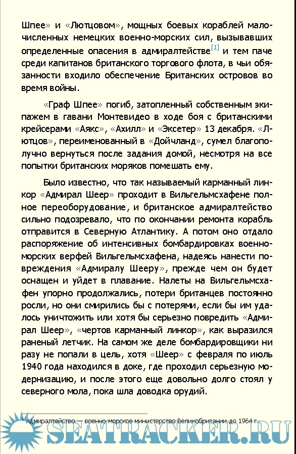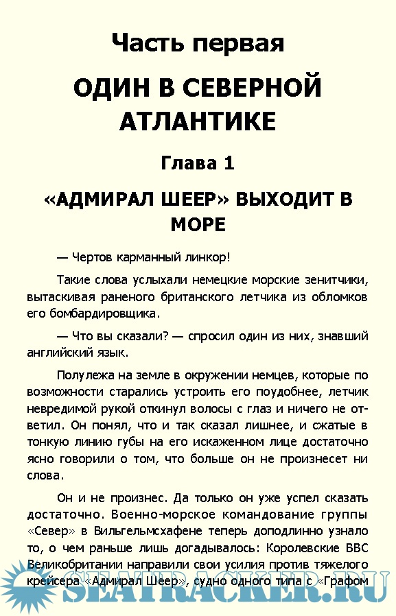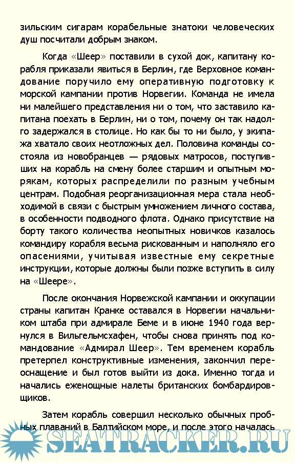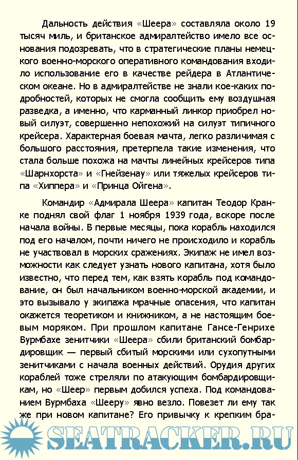 Описание: Адмирал Теодор Кранке и офицер Йохан Бреннеке объективно и подробно повествуют об истории знаменитого немецкого крейсера, действовавшего во всех климатических поясах от Арктики до Антарктики. За сто шестьдесят один день похода карманный линкор прошел 46 000 миль, захватил и отослал на родину 2 танкера, вывел из строя 19 судов. Эту операцию считают наиболее успешной из действий карманных линкоров в годы войны.
