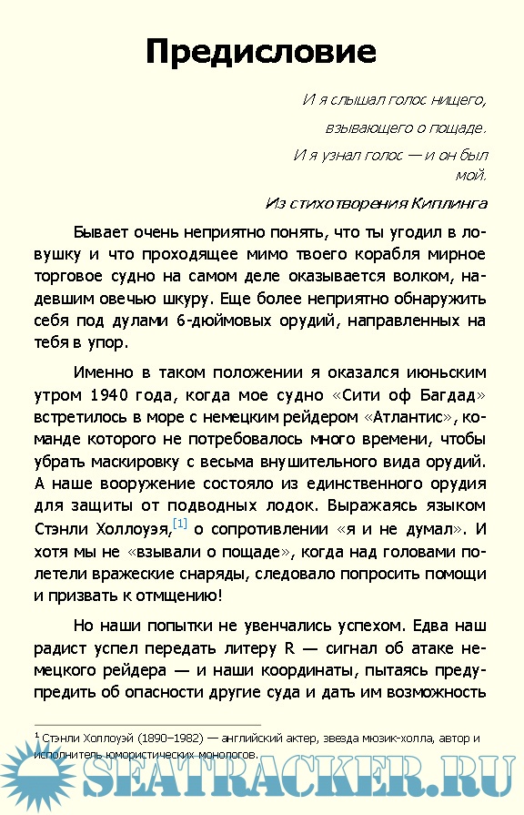 Содержание Введение Предисловие К читателю Глава 1. В Бремене Глава 2. Волк в овечьей шкуре Глава 3. Держитесь в стороне от наших винтов! Глава 4. Мы бросаем вызов Глава 5: Корсары и кимоно Глава 6. Крещение кровью: Глава 7. Опасность у берега Глава 8. Дети под дулами наших орудий Глава 9. Девять смертельных встреч Глава 10. Гибель "Тирраны" Глава 11. Гости фюрера Глава 12. "Адское судно" Глава 13. Этот дартмутский вид Глава 14. Совершенно секретно'. Глава 15. Земля!~ Глава 16. На скалах Глава 17. Могила на далеком юге Глава 18. Где встречаются волки. Глава 19. Международный инцидент Глава 20. Корабли, которые проходят Глава 21. Напряжение начало сказываться Глава 22. Последняя жертва Глава 23. Feindlicher Kreuzer in Sicht! Глава 24. Так мы тонули Глава 25. И тонули снова Глава 26. Домой подводным путем Эпилог: ПРАВИЛА ПОЖАРНОЙ БЕЗОПАСНОСТИ НА СУДАХ ВНУТРЕННЕГО ВОДНОГО ТРАНСПОРТА РОССИЙСКОЙ ФЕДЕРАЦИИ
